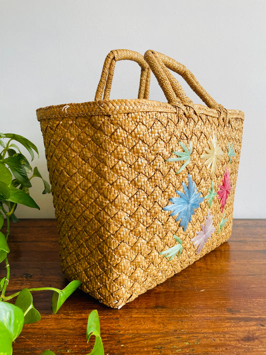 Woven Straw Beach Bag Purse with Raffia Starburst Flower Design