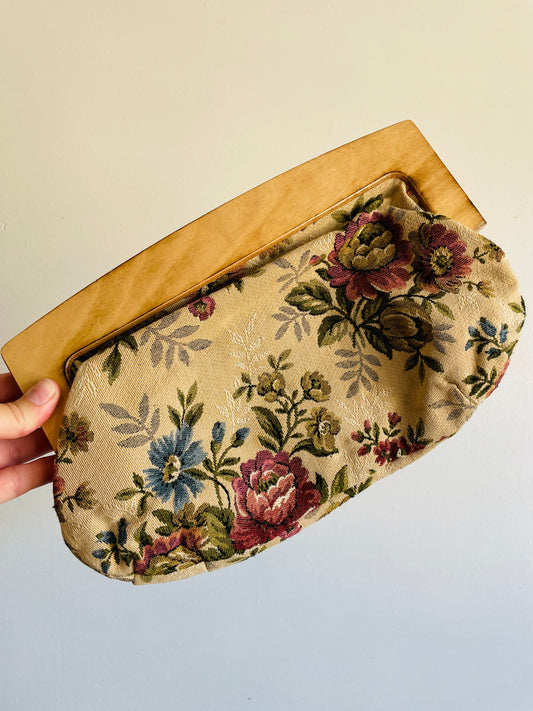 Wood & Floral Tapestry Fabric Clutch Purse with Magnetic Clasp