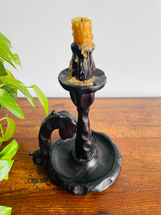 Large Wood Brutalist Spanish Revival Gothic Castlecore Style Chamberstick Candle Holder with Dripping Candle