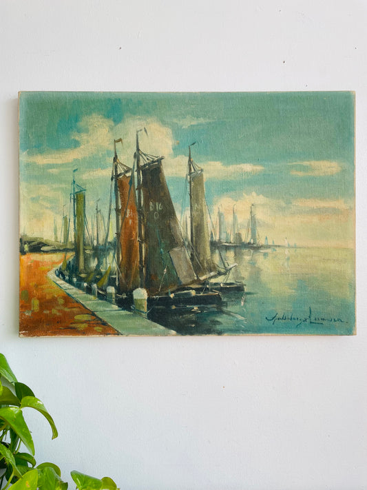Vintage Original Art Nautical Painting of Ships in Harbour