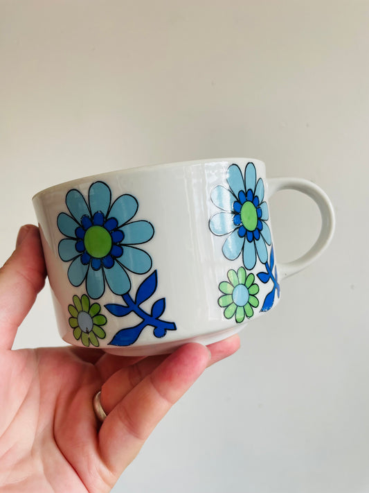 Groovy Soup Bowl with Handle & Blue & Green Flower Power Design - Would Also Make a Great Planter - Made in Japan