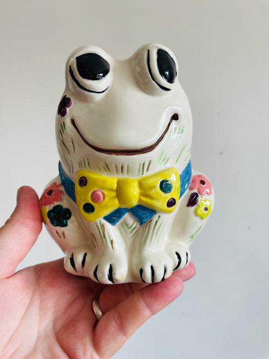 Adorable 1969 Ceramic Frog with Bow Tie and Flowers - Painted & Signed by Doris