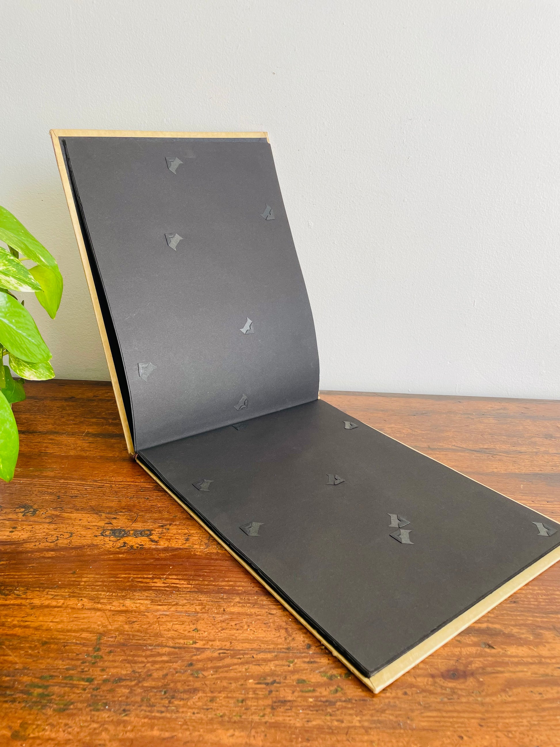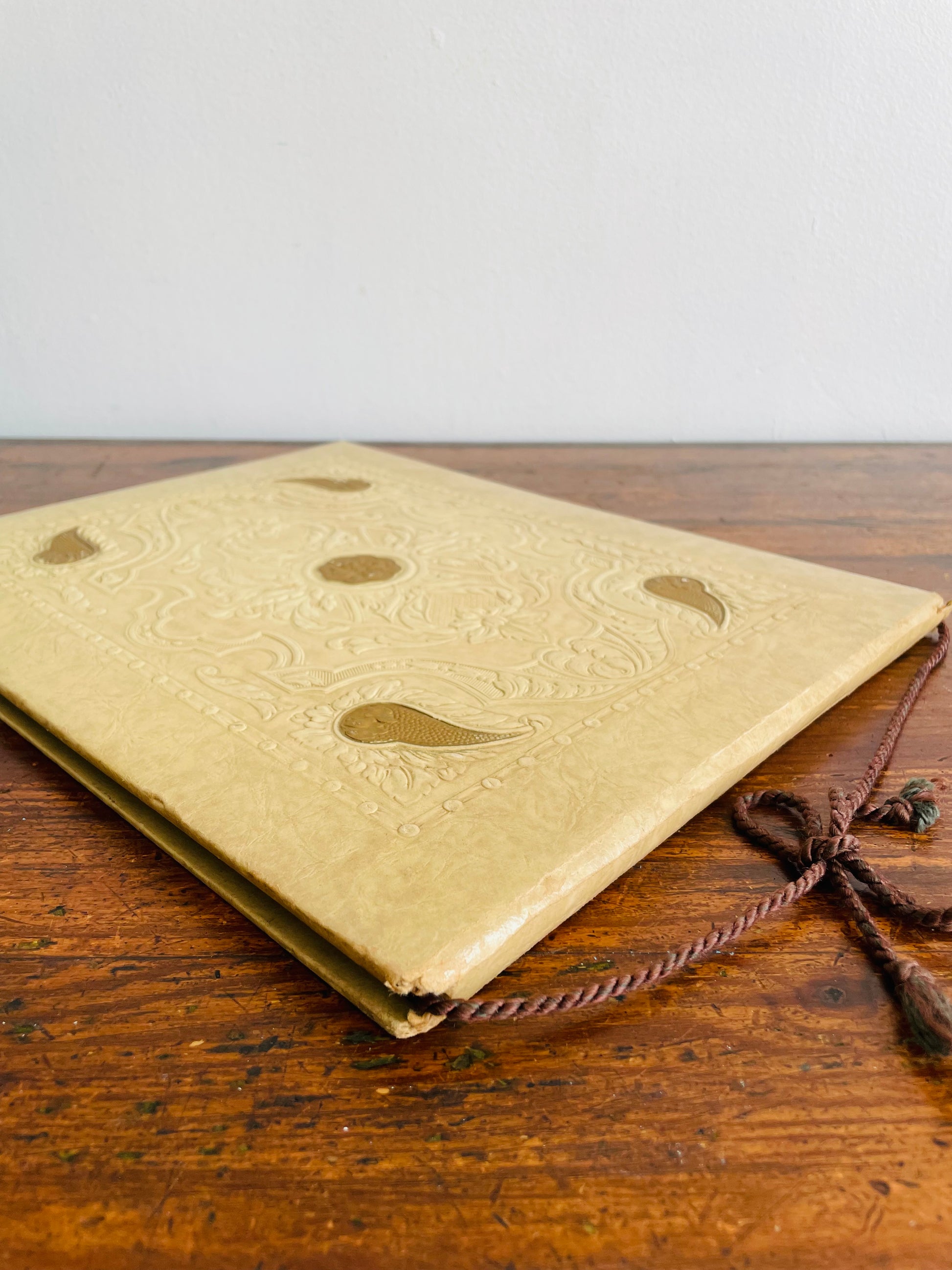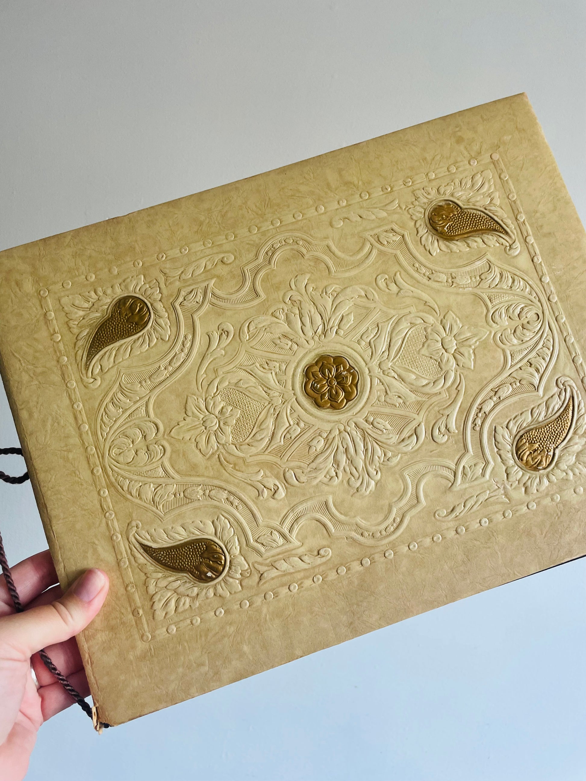 A beautiful photo album or scrapbook that has an embossed cover, black pages inside, and is tied with a brown string.