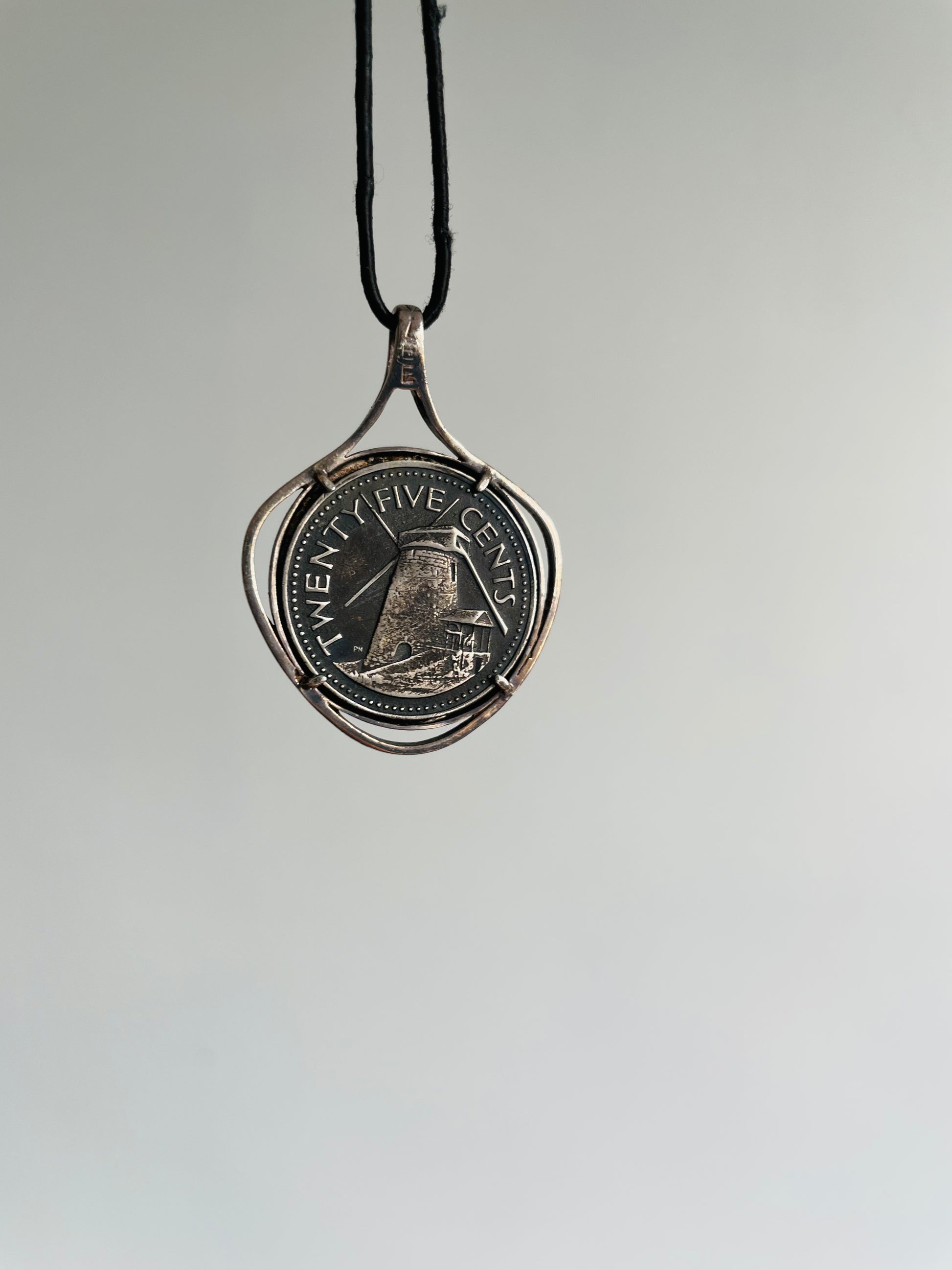 This is a twenty five cent coin from Barbados that has the windmill on one side and then a hand painted beach scene on the other side. The paint has a glaze on it or has been baked with some sort of process to seal in the paint. The surface is soft and smooth. The coin is being held by a metal loop which attaches to the black rope that has a waxy coating.