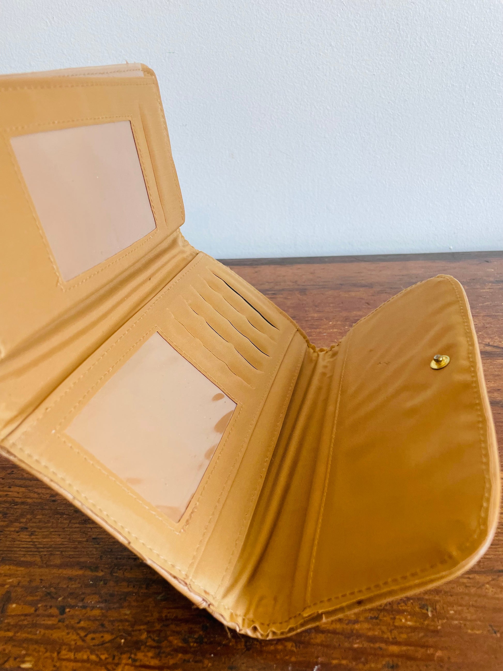 Features: External coin purse on back which snaps to open and close. Front snaps open and closed and unfolds to reveal long pockets, a carbon checkbook divider, and spaces for cards to be inserted.