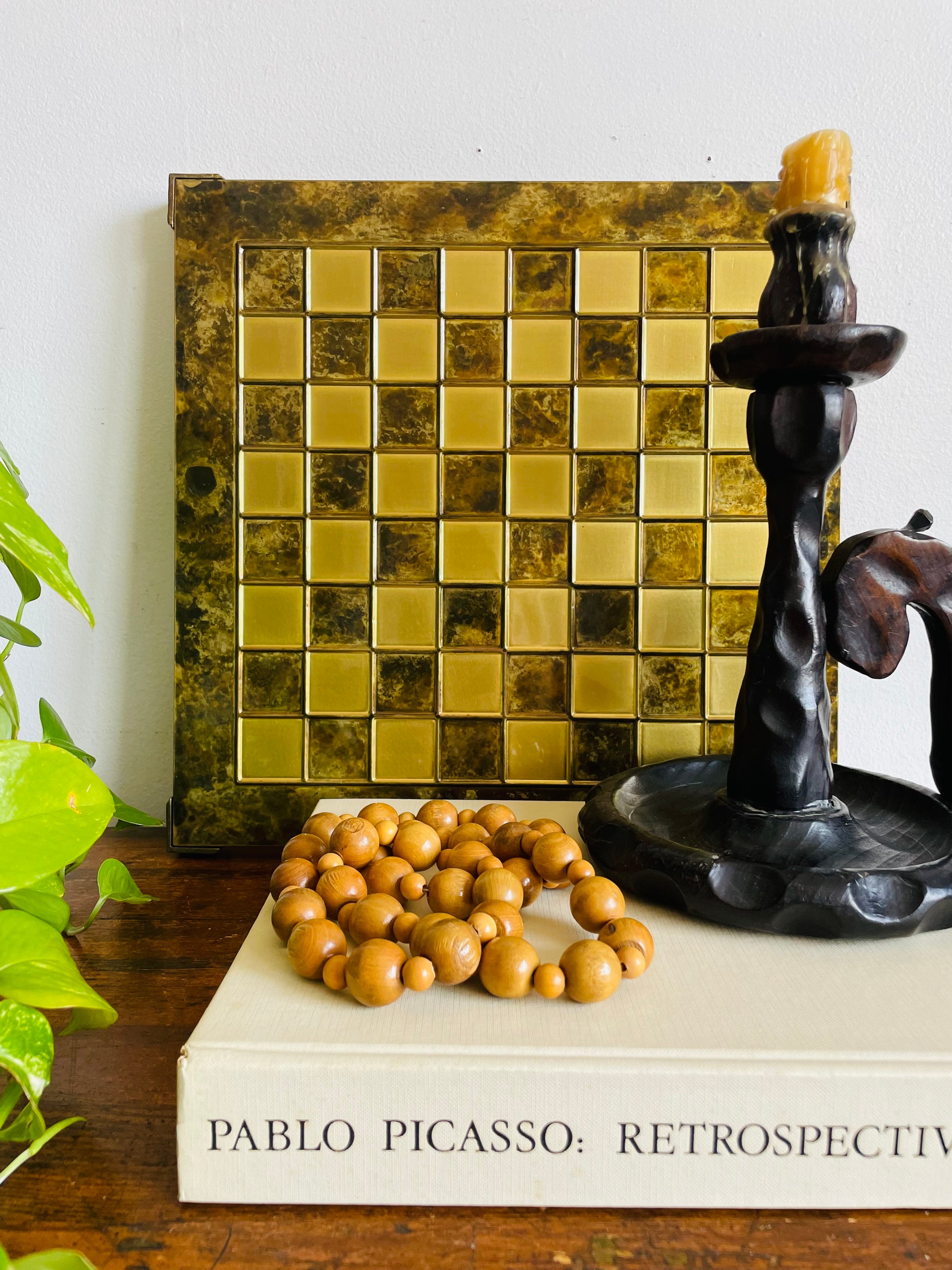 Although meant for chess, this gorgeous board makes a stunning tray for a coffee table or vanity display. You can also use it as a backdrop for a touch of interest in the background on a shelf or mantle. It is an excellent piece for styling.