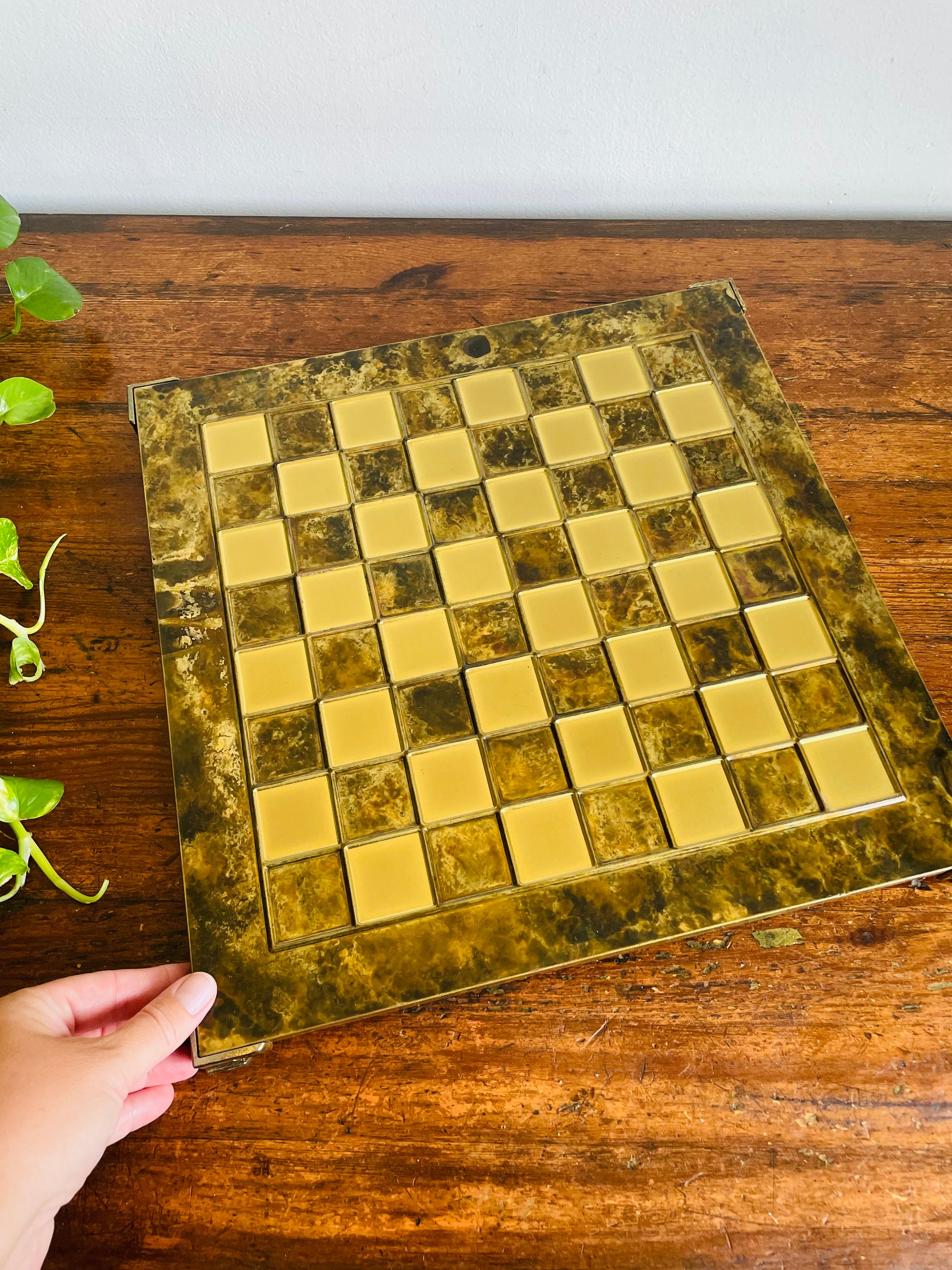 Footed Solid Brass Chessboard with Marbled Design - Great for a Game, Staging, Tray, Background, Etc.