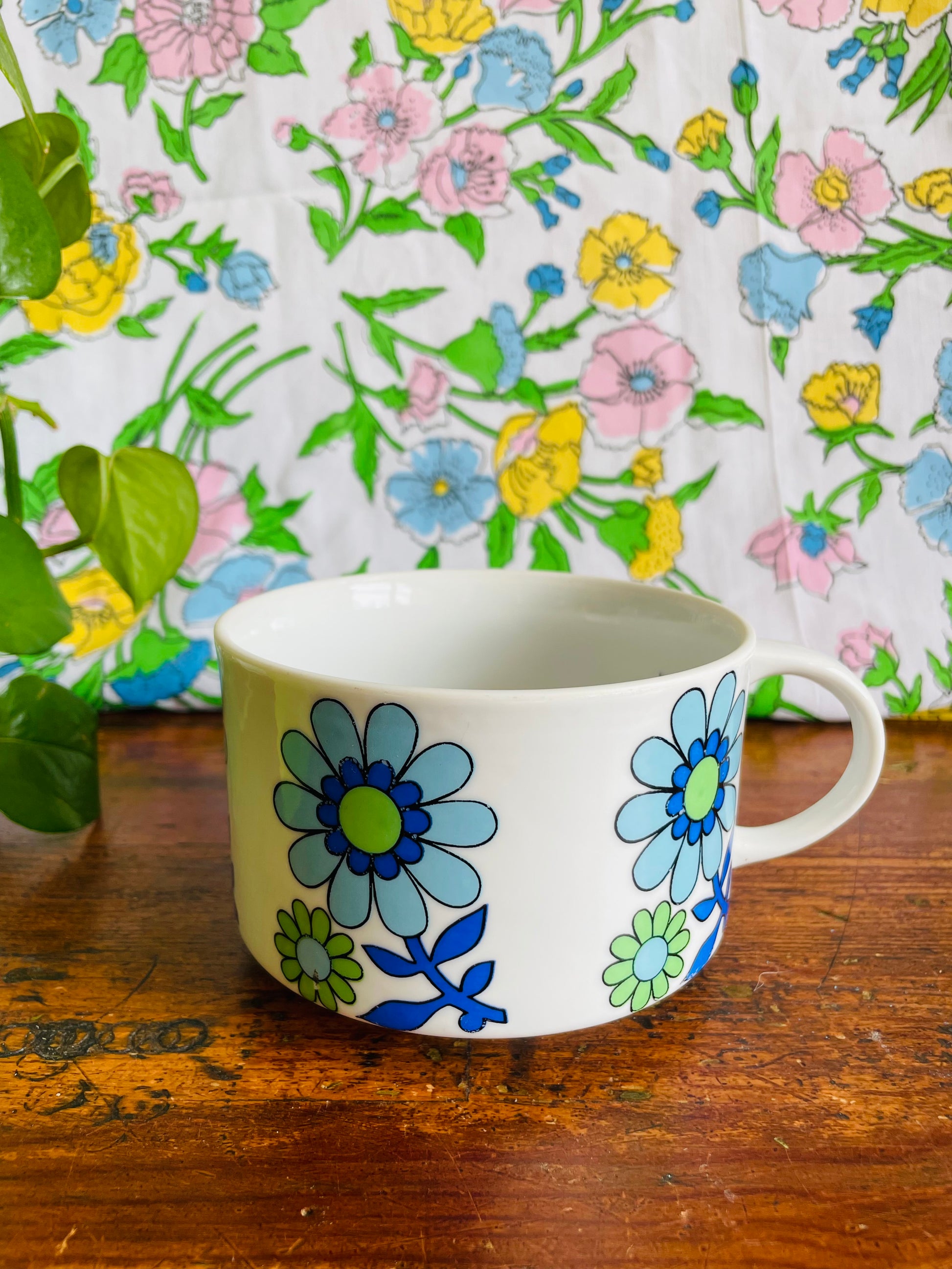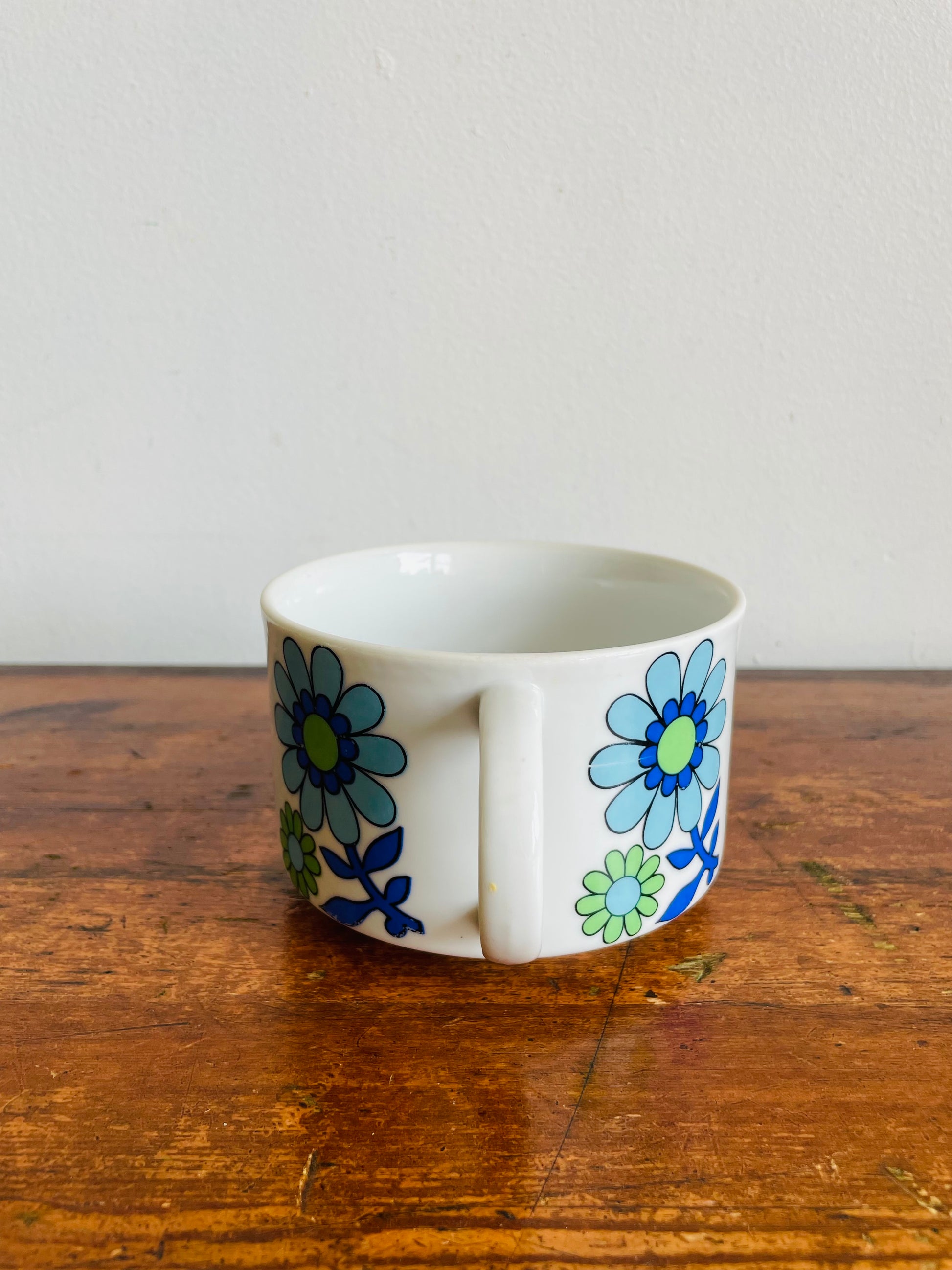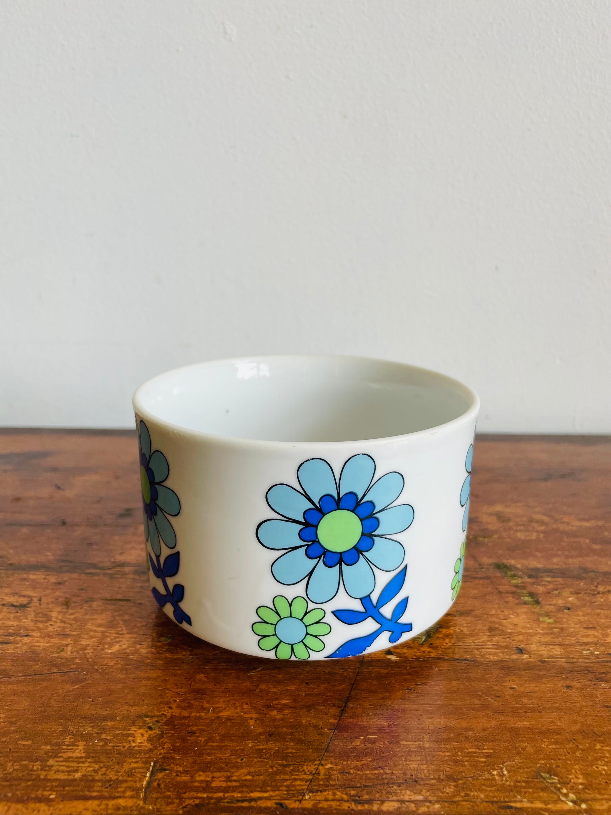 Groovy Soup Bowl with Handle & Blue & Green Flower Power Design - Would Also Make a Great Planter - Made in Japan