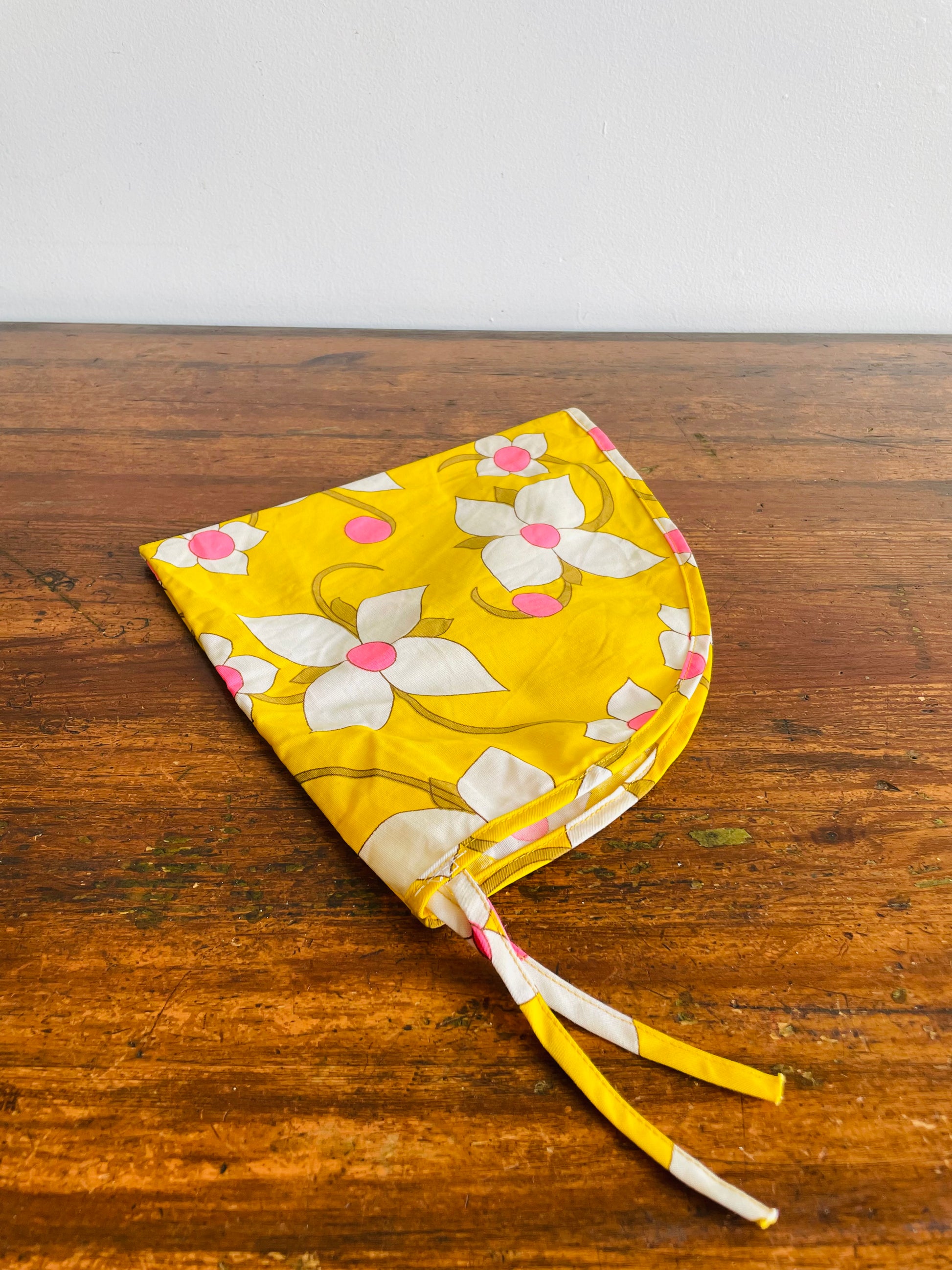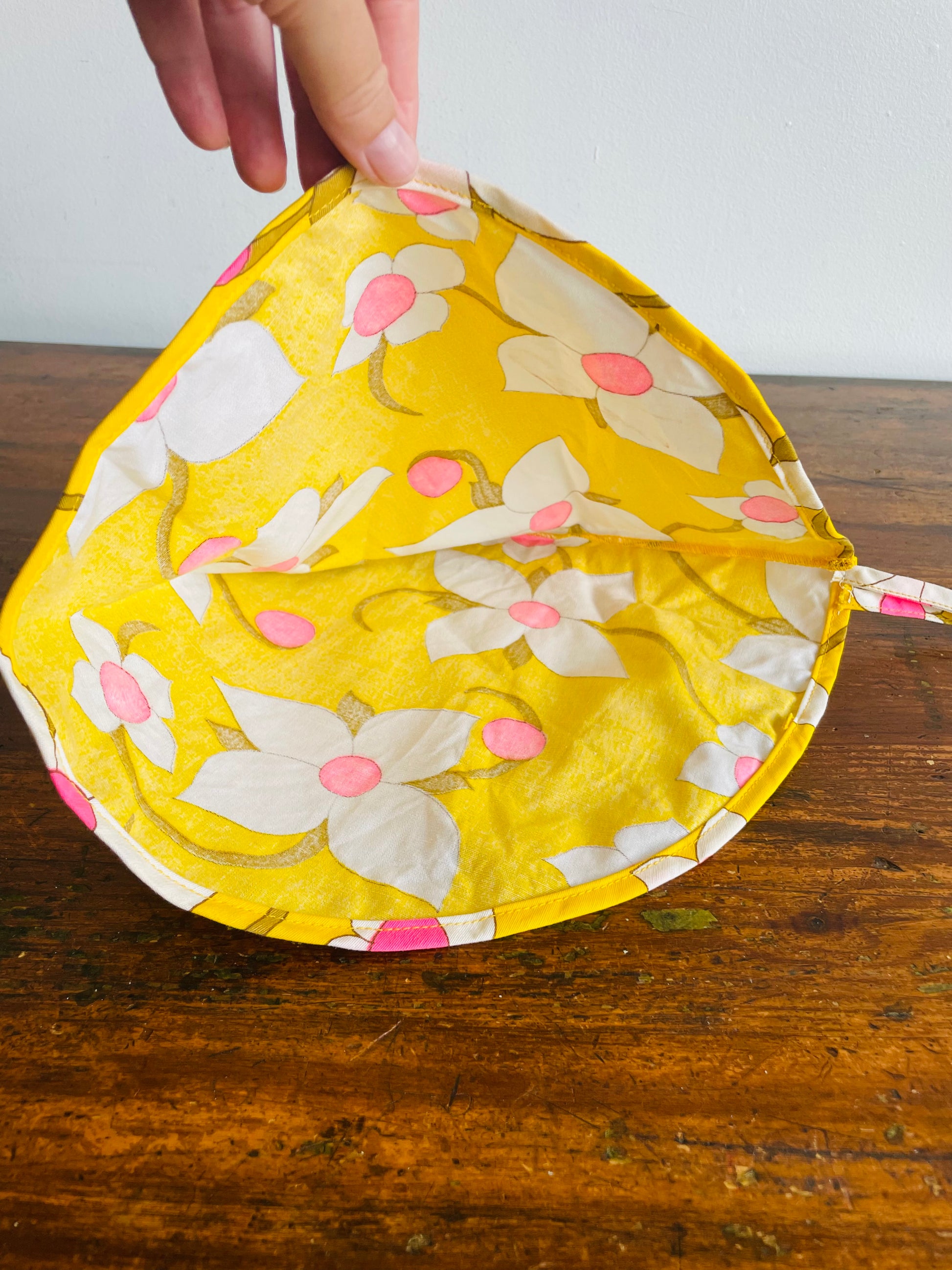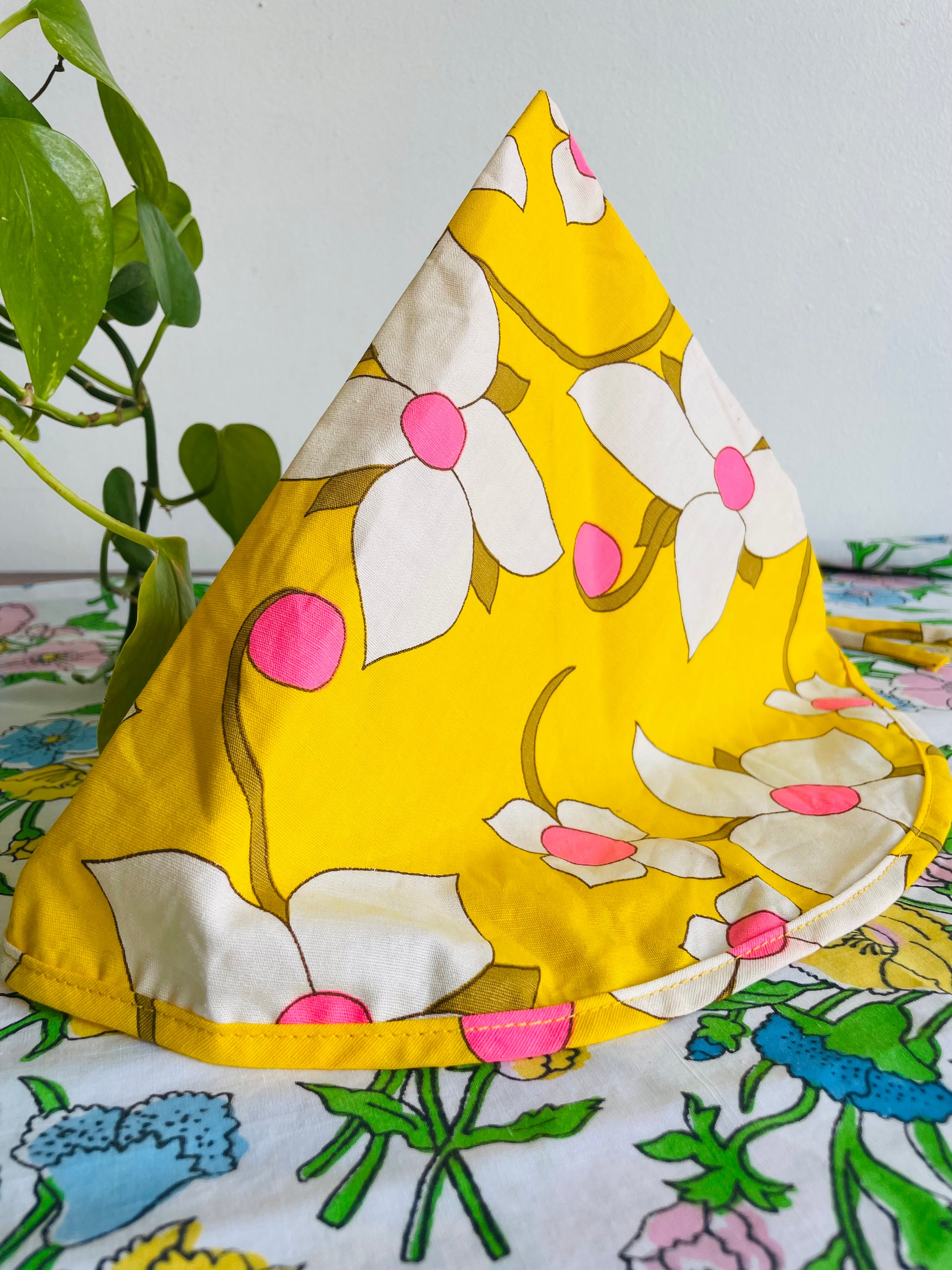Groovy Yellow Fabric Triangle Pouch Holder or Hat with White & Pink Flower Design - Solve the Mystery of What This Is!