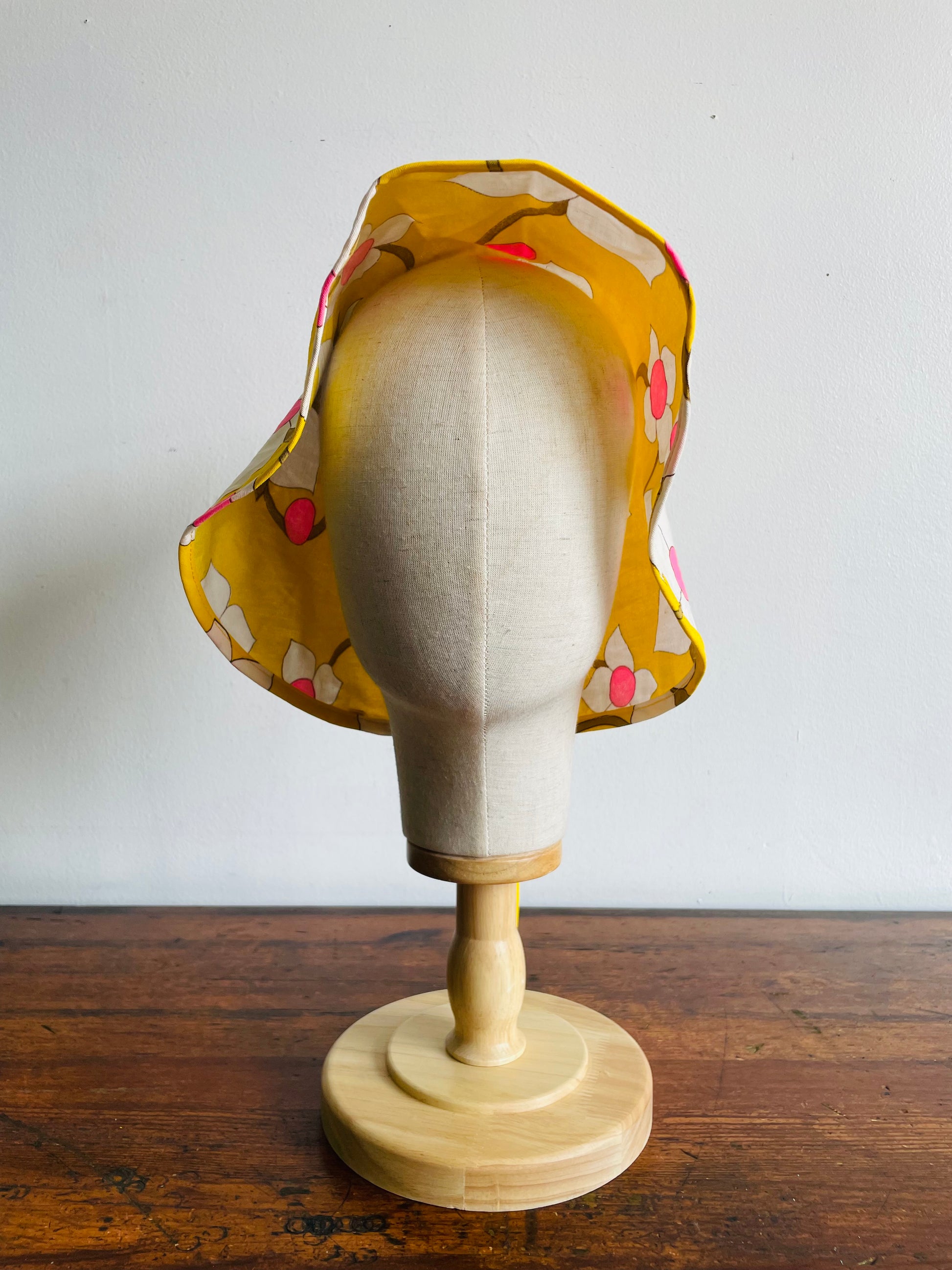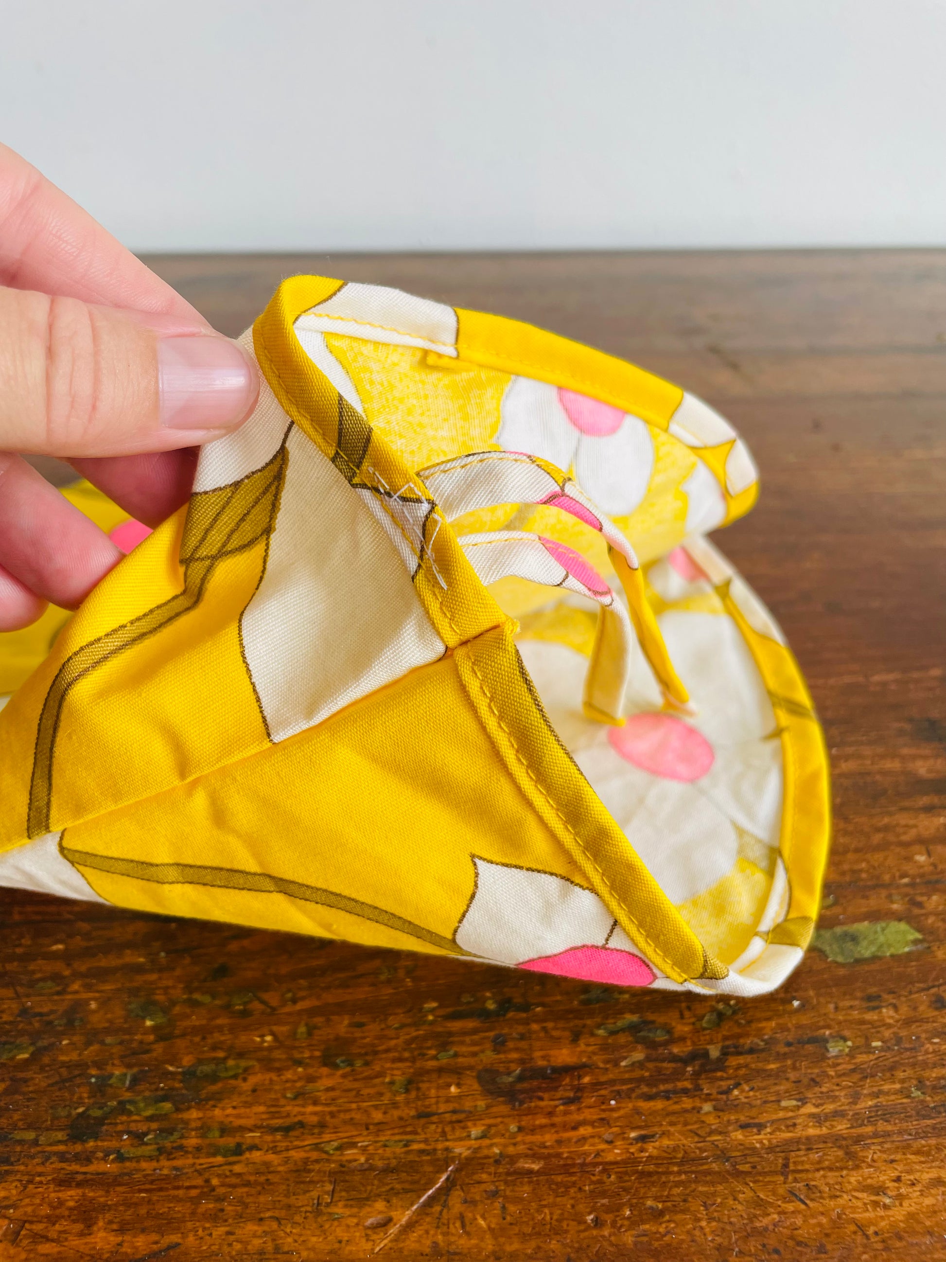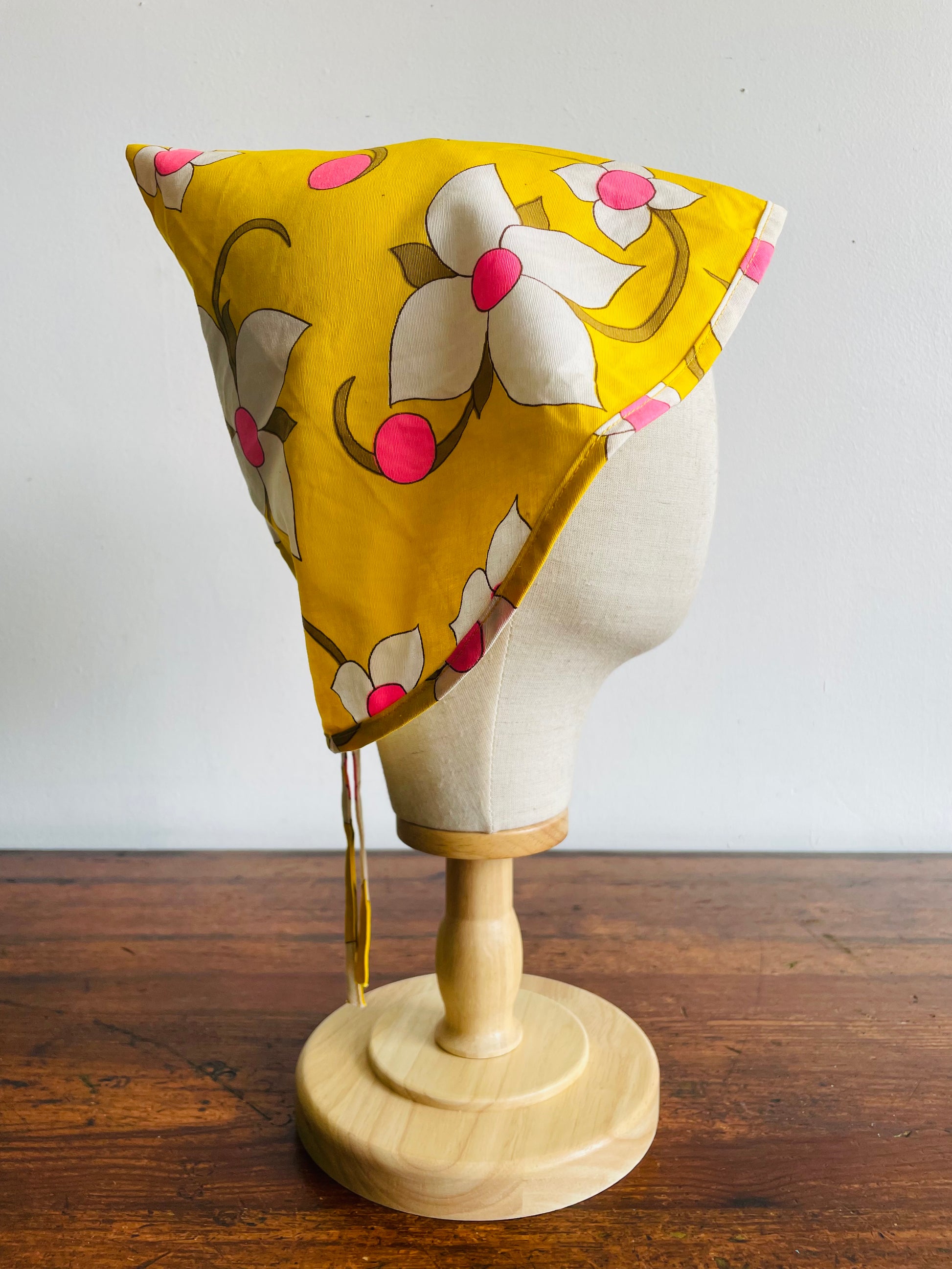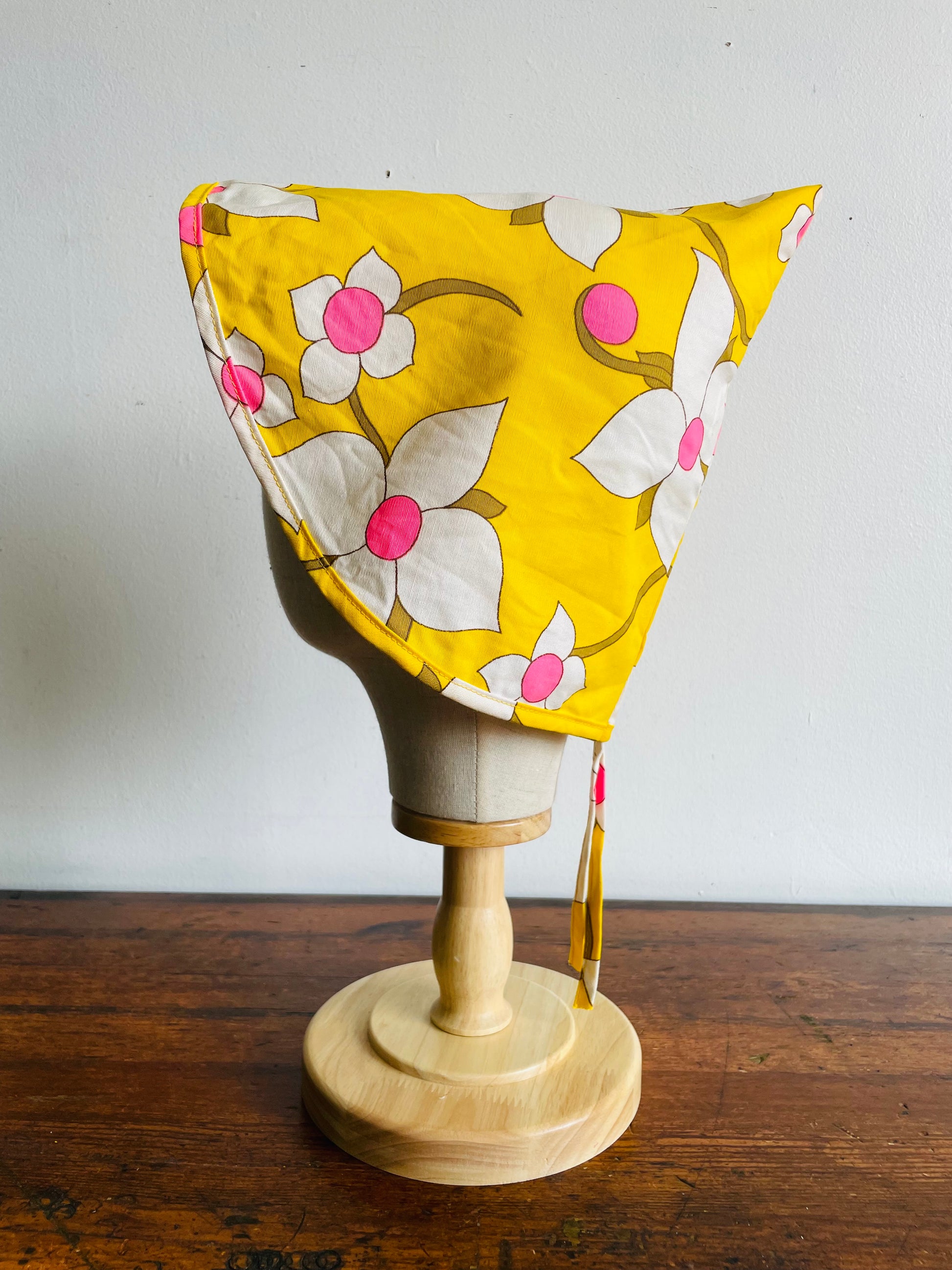Groovy Yellow Fabric Triangle Pouch Holder or Hat with White & Pink Flower Design - Solve the Mystery of What This Is!