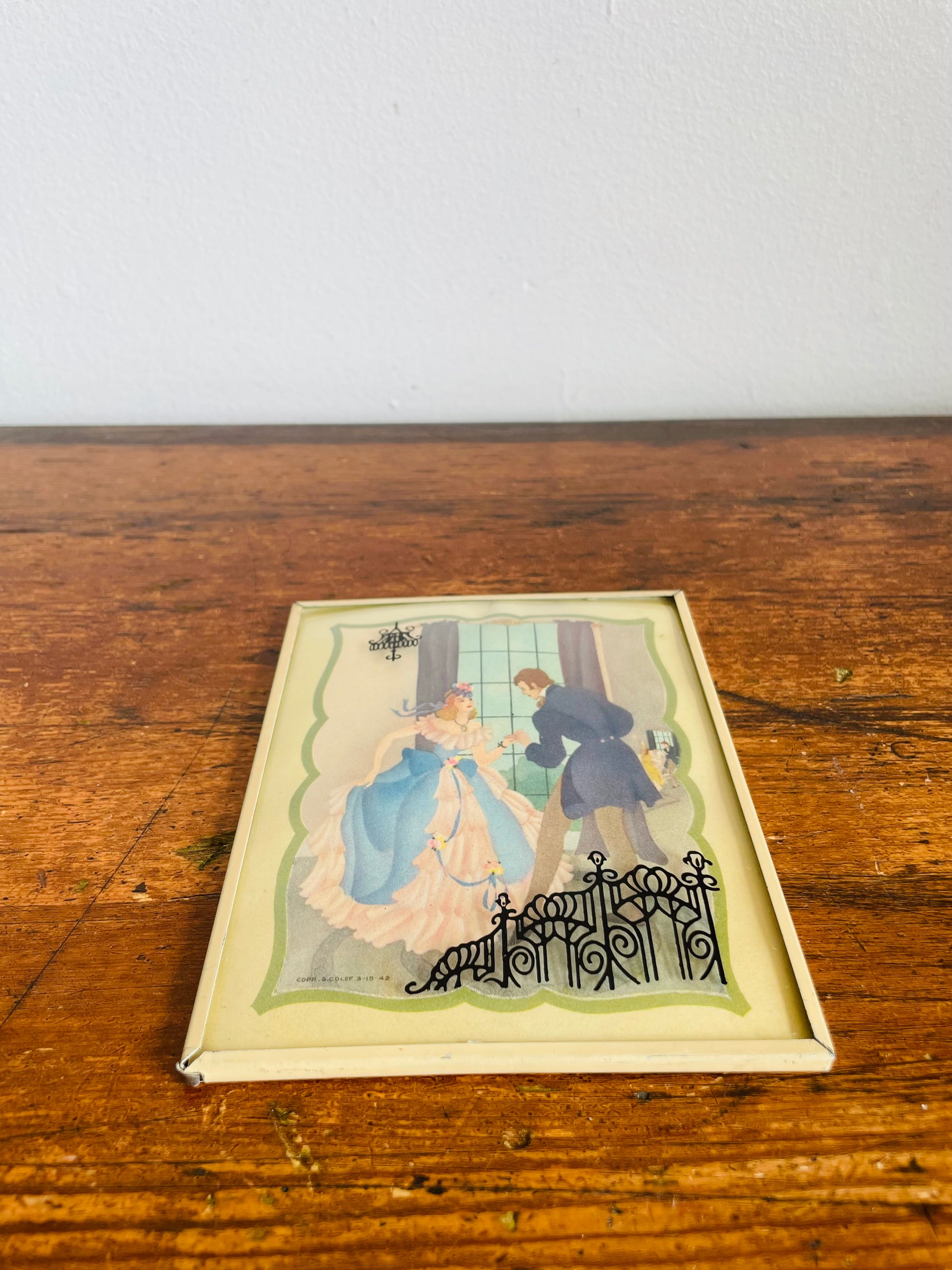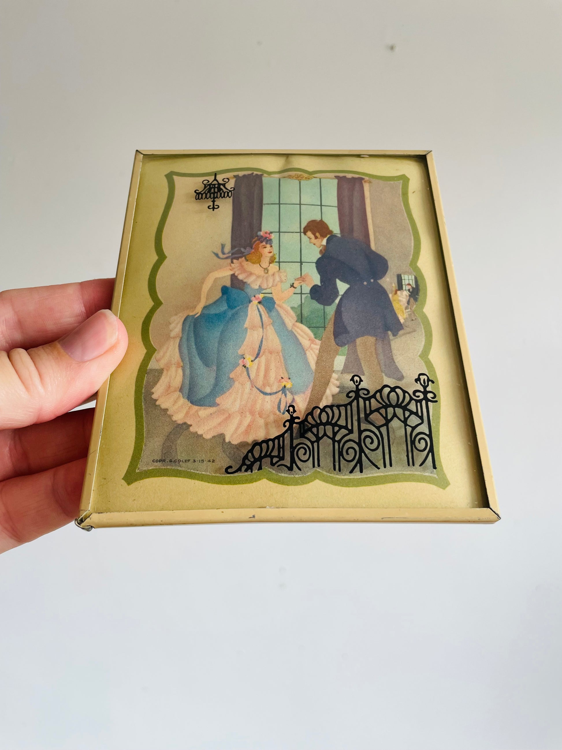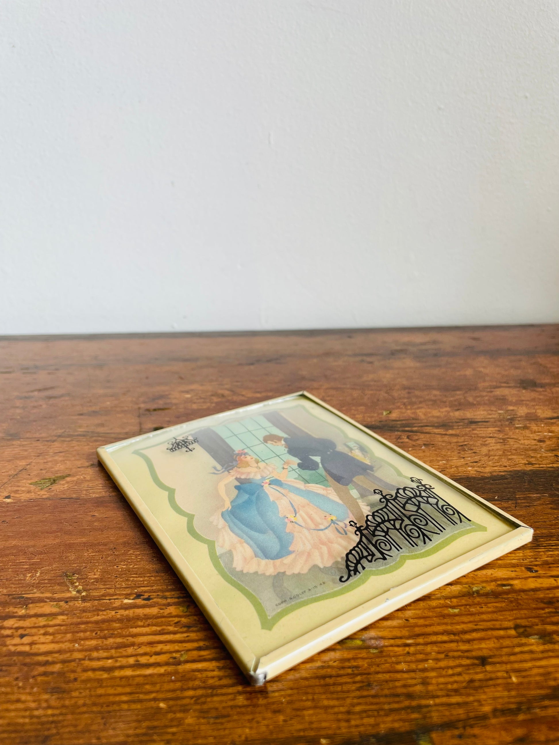 Mini Copr. S. Colef Reverse Painted Silhouette Lithograph Picture on Convex Bubble Glass - Courting Couple Greeting