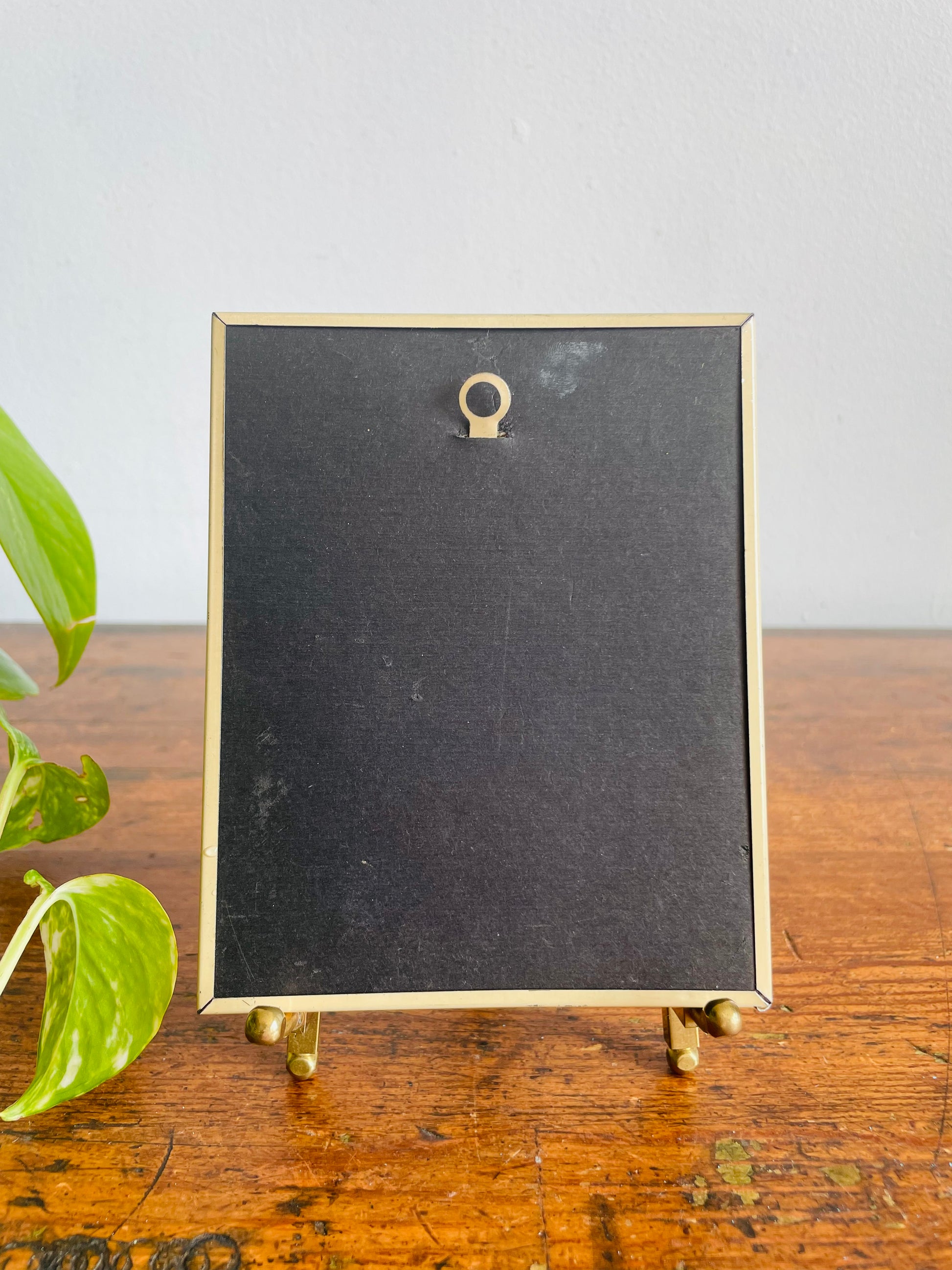 The glass is convex bubble glass so it creates a dome effect. The black images are on the glass which allows for a 3D image with the lithograph print picture background behind. The frame is metal.