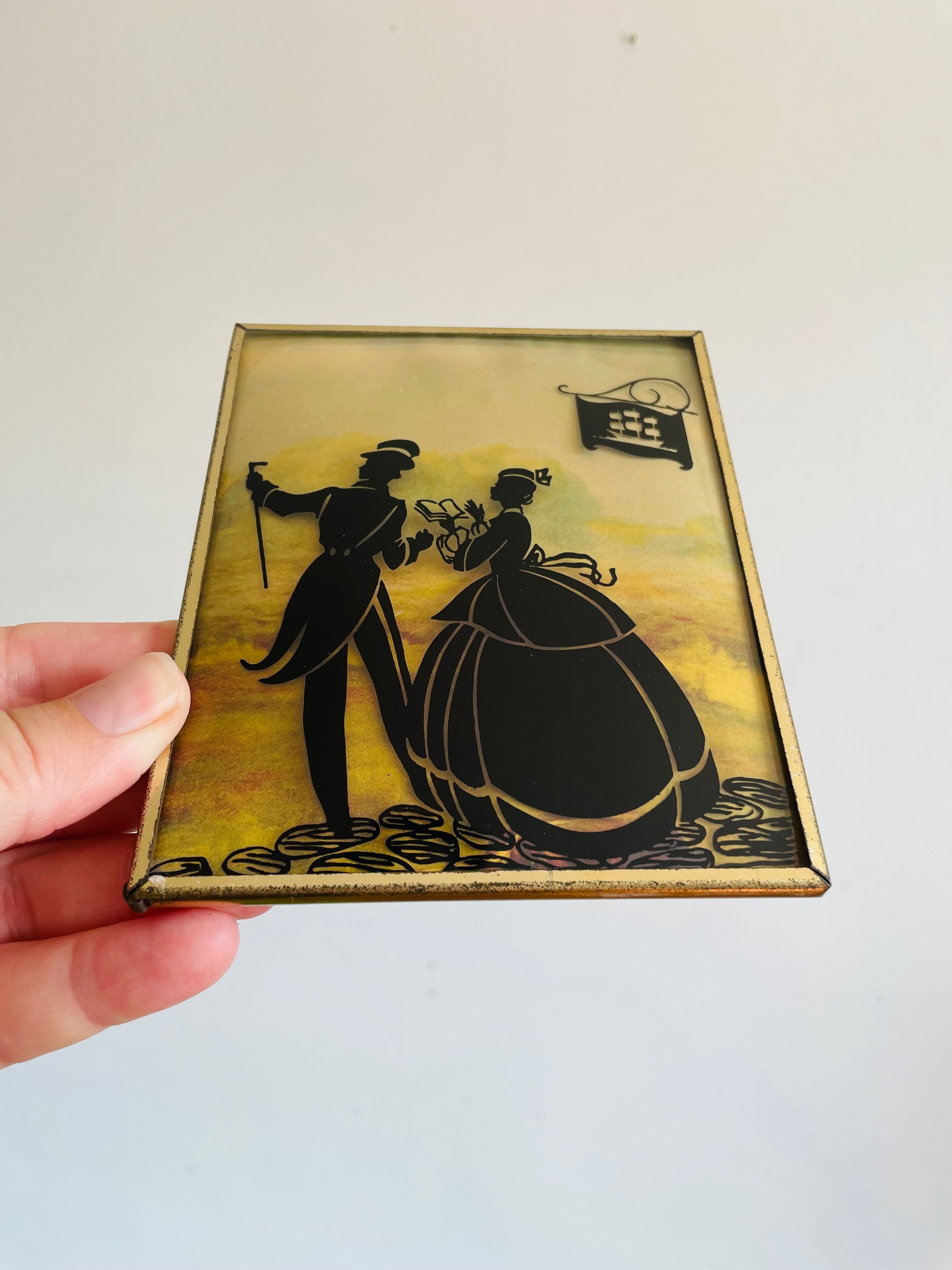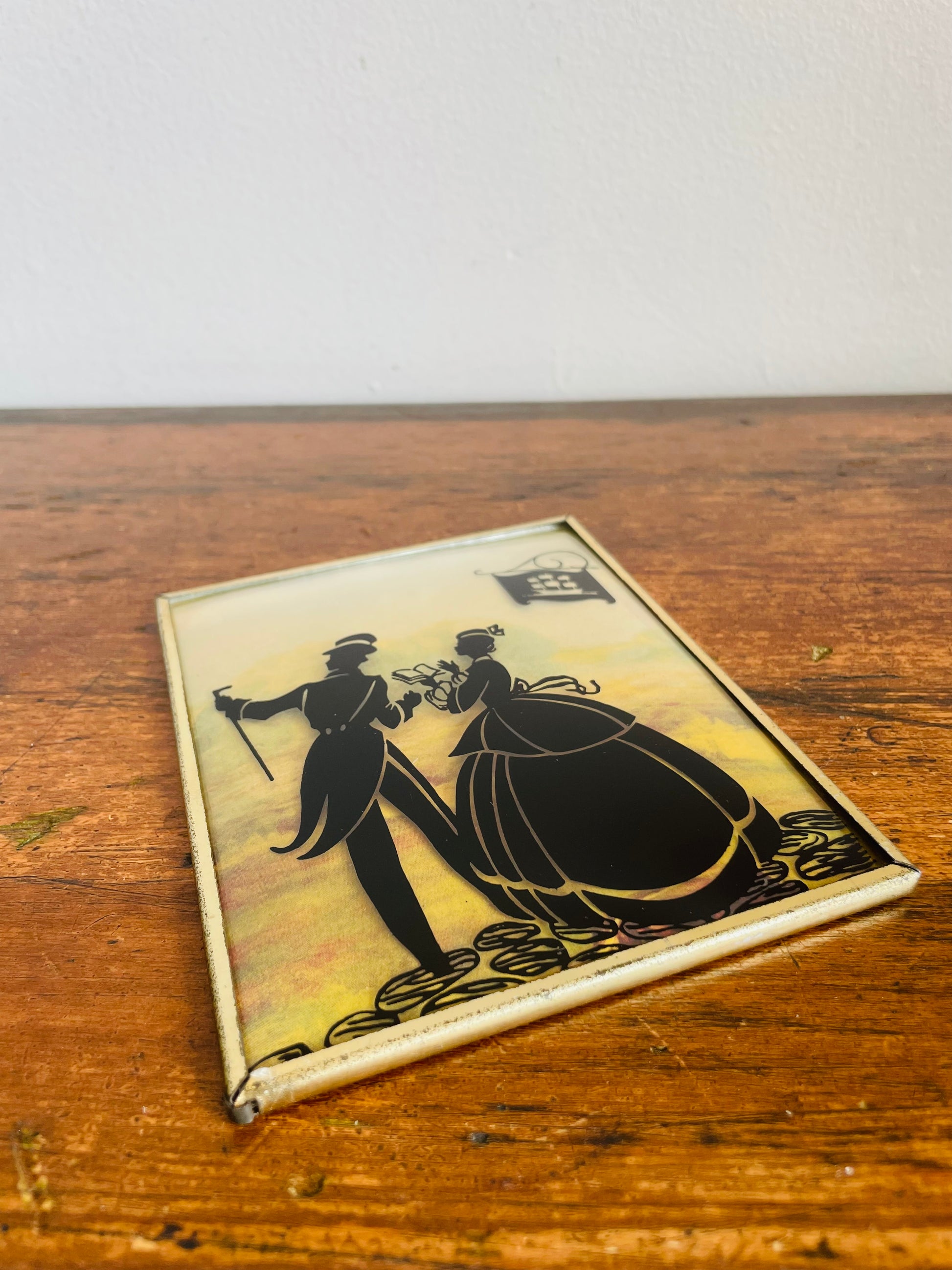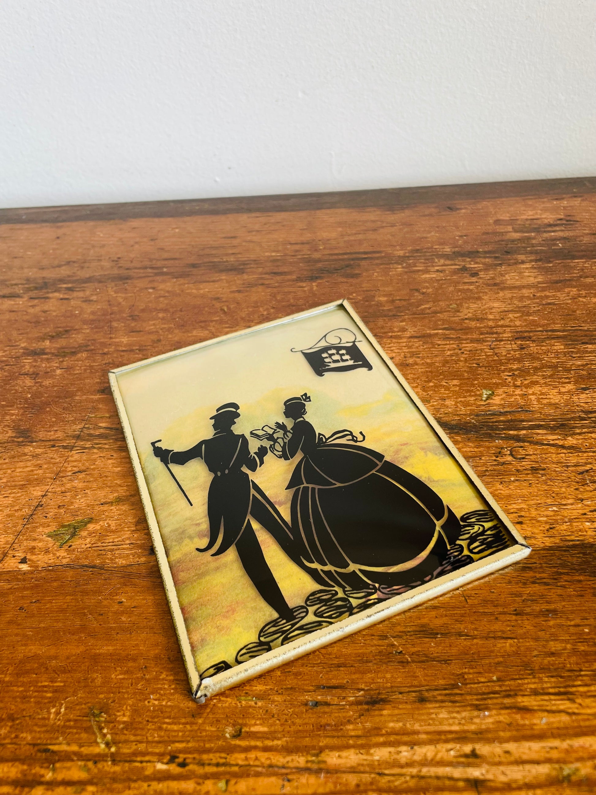 Mini Reverse Painted Silhouette Lithograph Picture on Convex Bubble Glass - Courting Couple on Cobblestone Streets