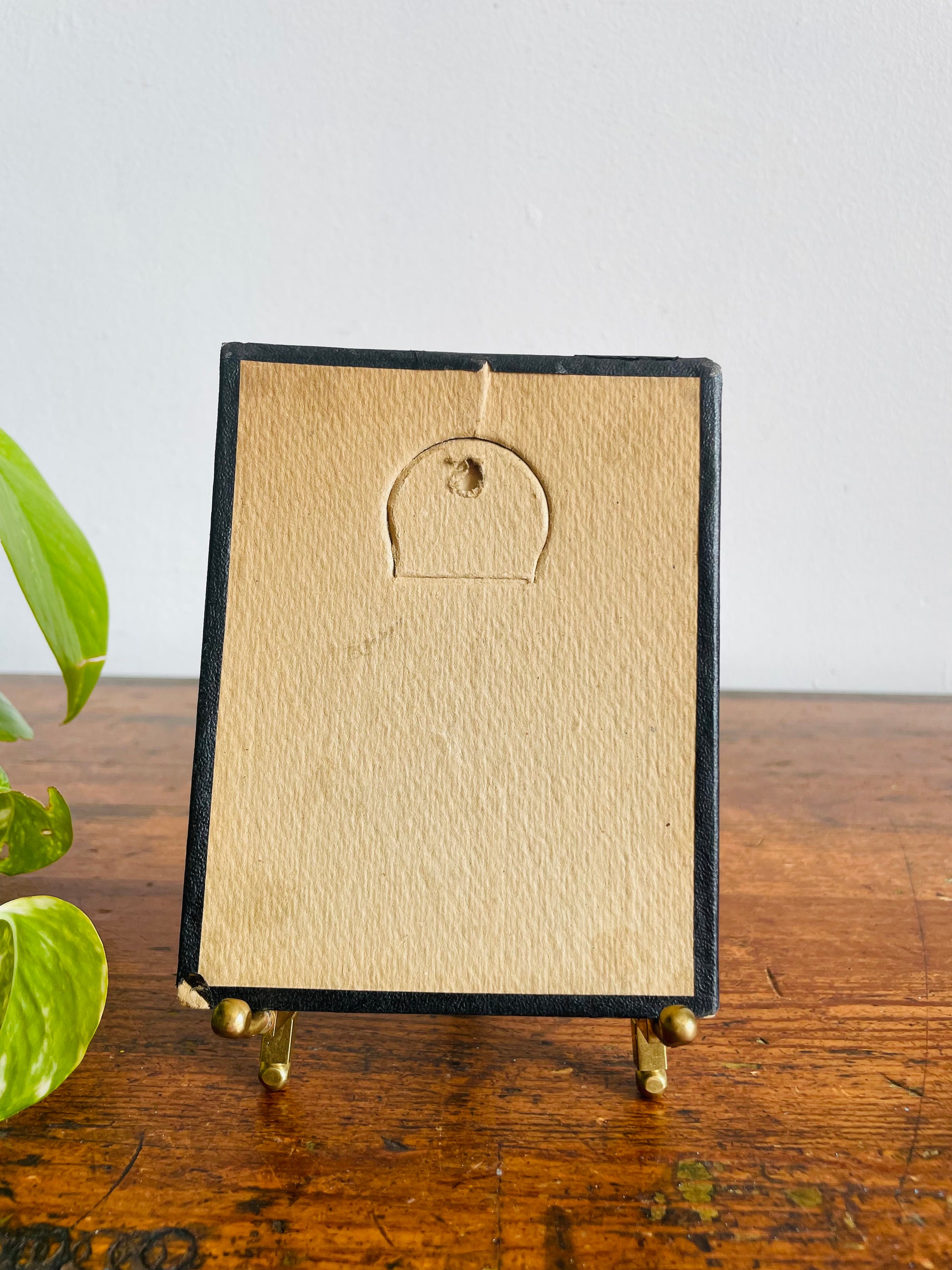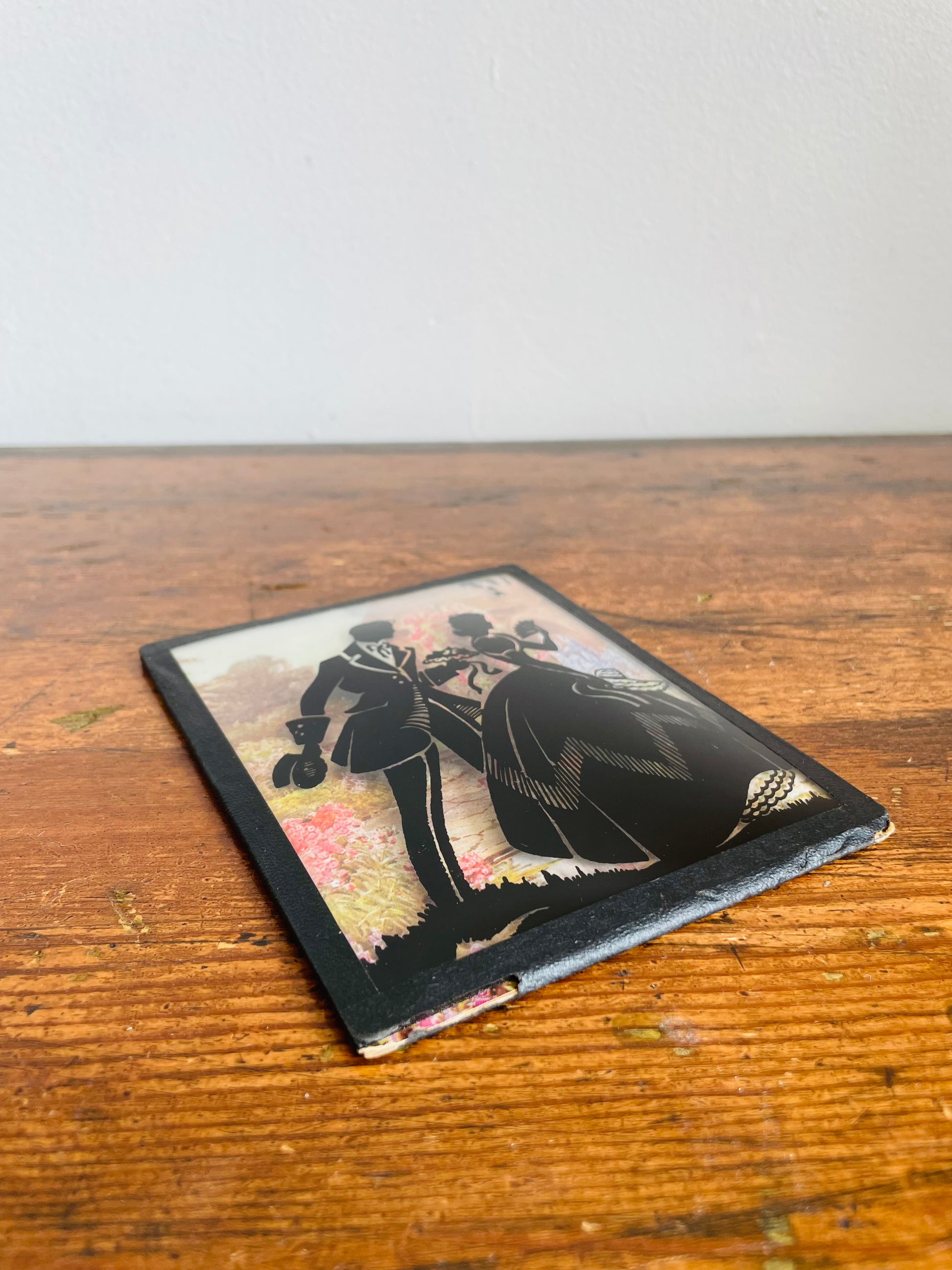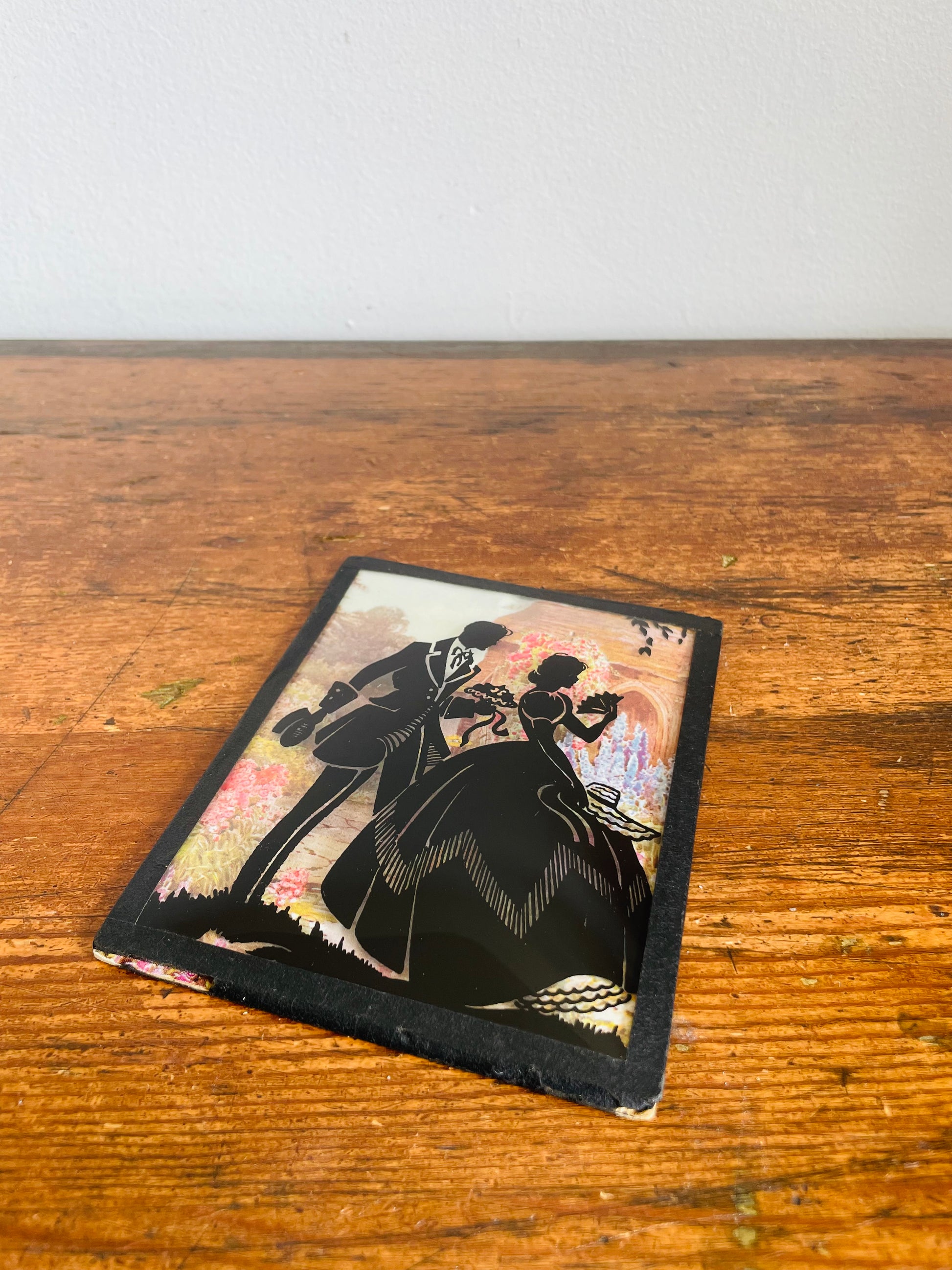 Mini Reverse Painted Silhouette Lithograph Picture on Convex Bubble Glass - Man Bringing Flowers in Cottage Garden