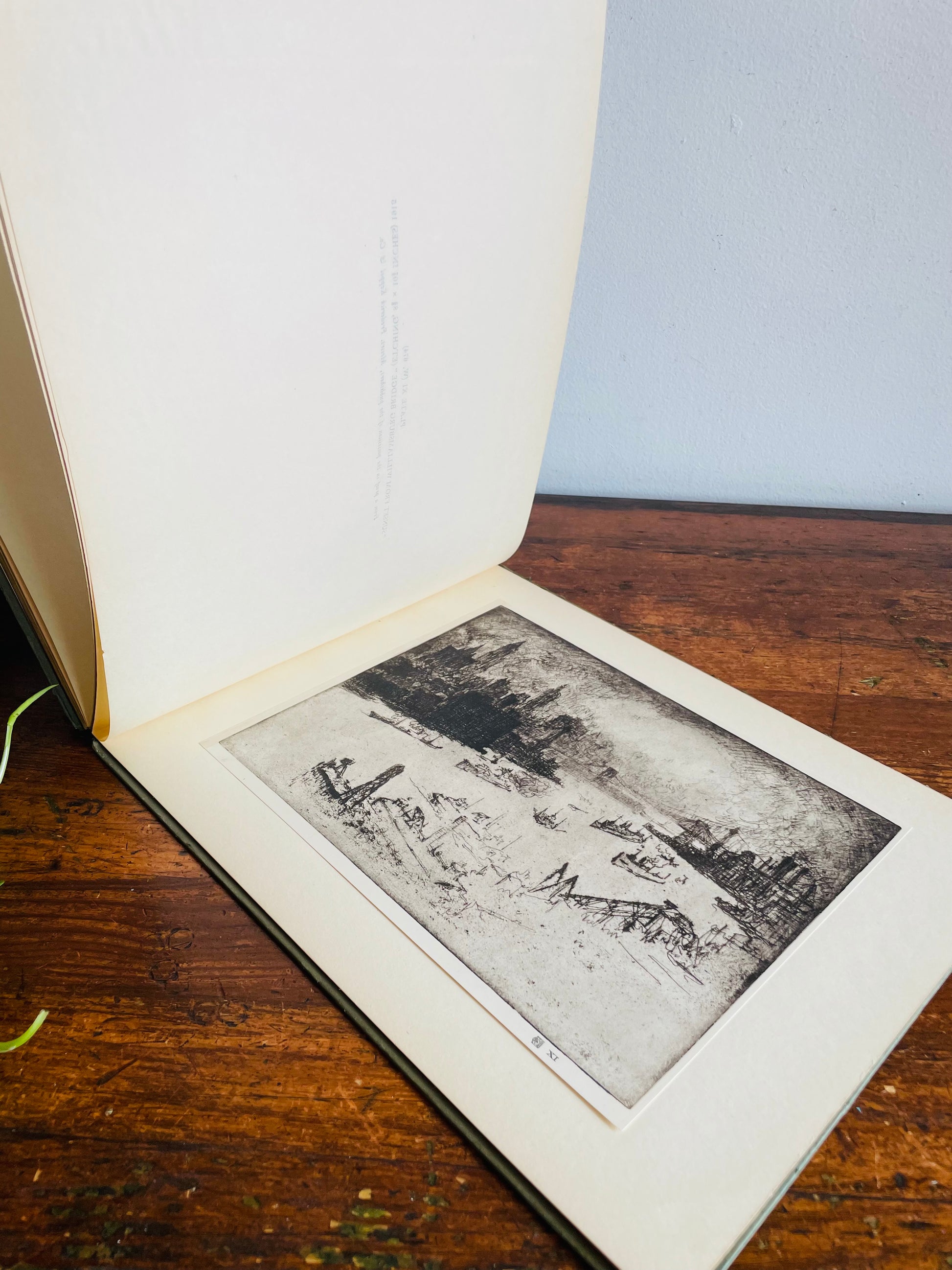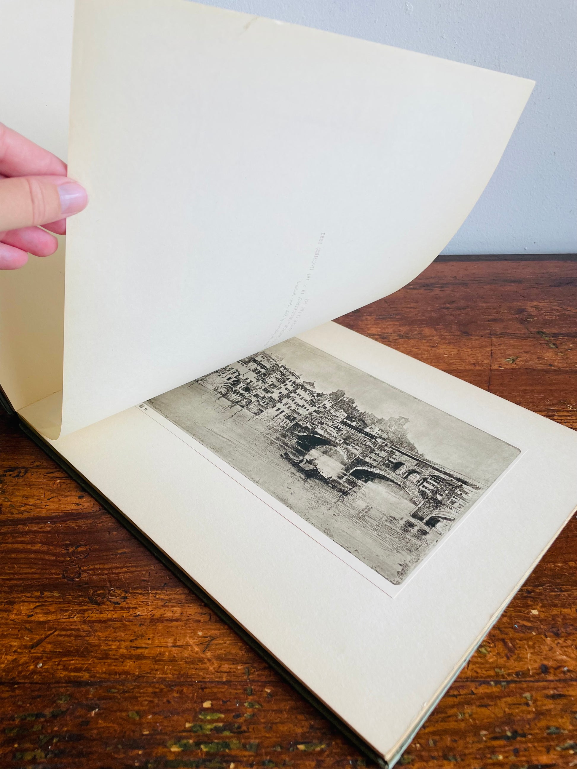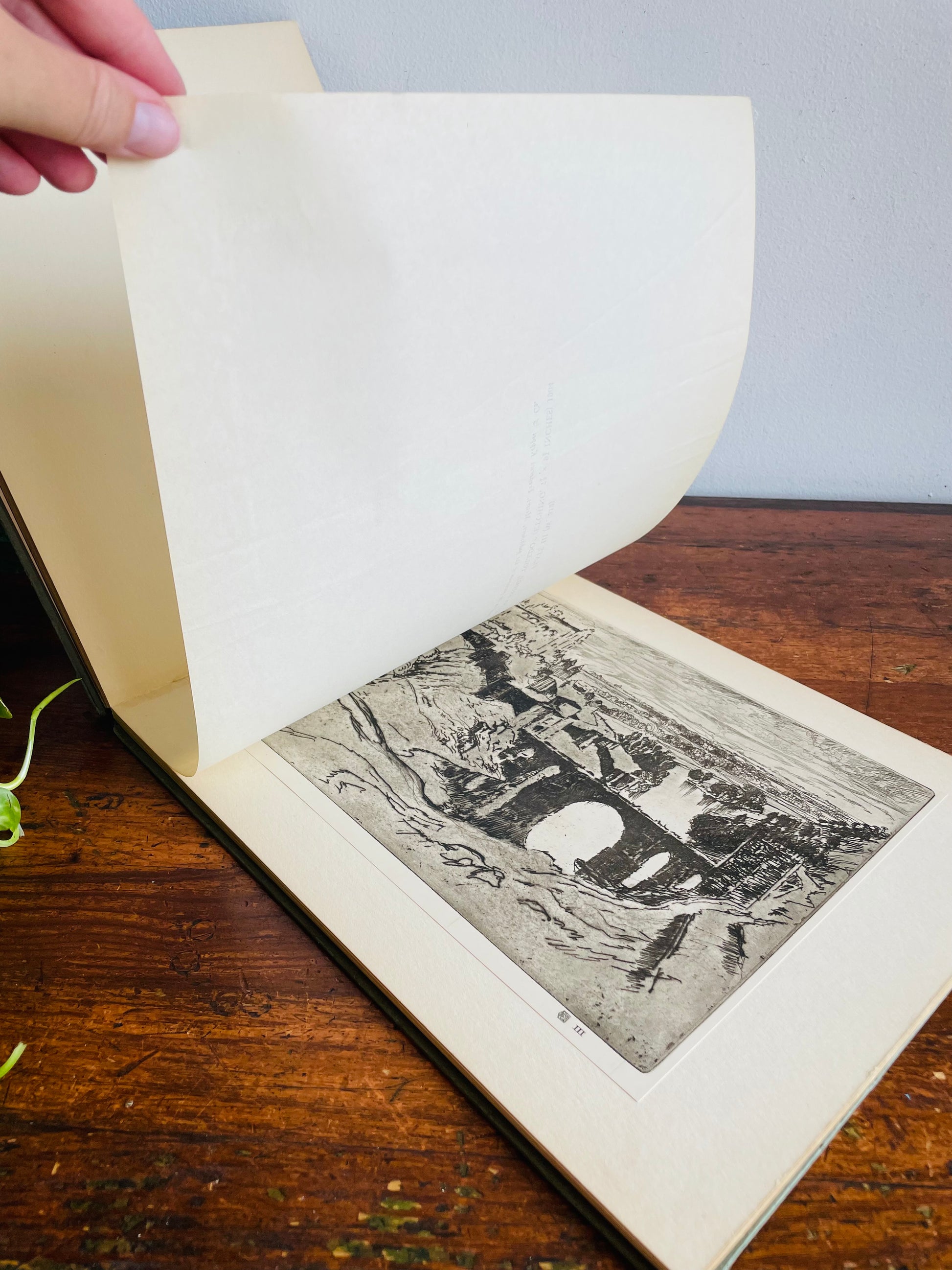 A lovely art book full of etchings that can be used as a book or to take the pages and make framed artwork from. The etchings are only attached loosely on one side of the pages so you might be able to remove them, or you could remove the entire page and use the backing page as a mat for the etching print and frame the whole page.