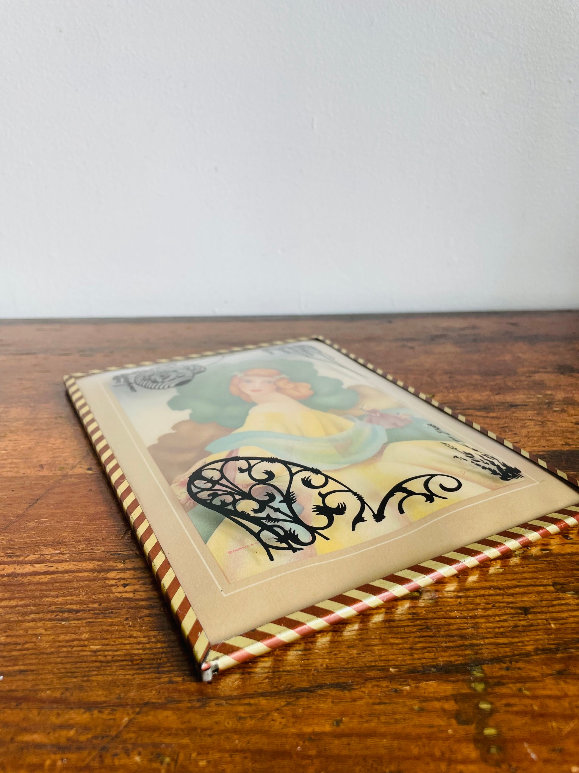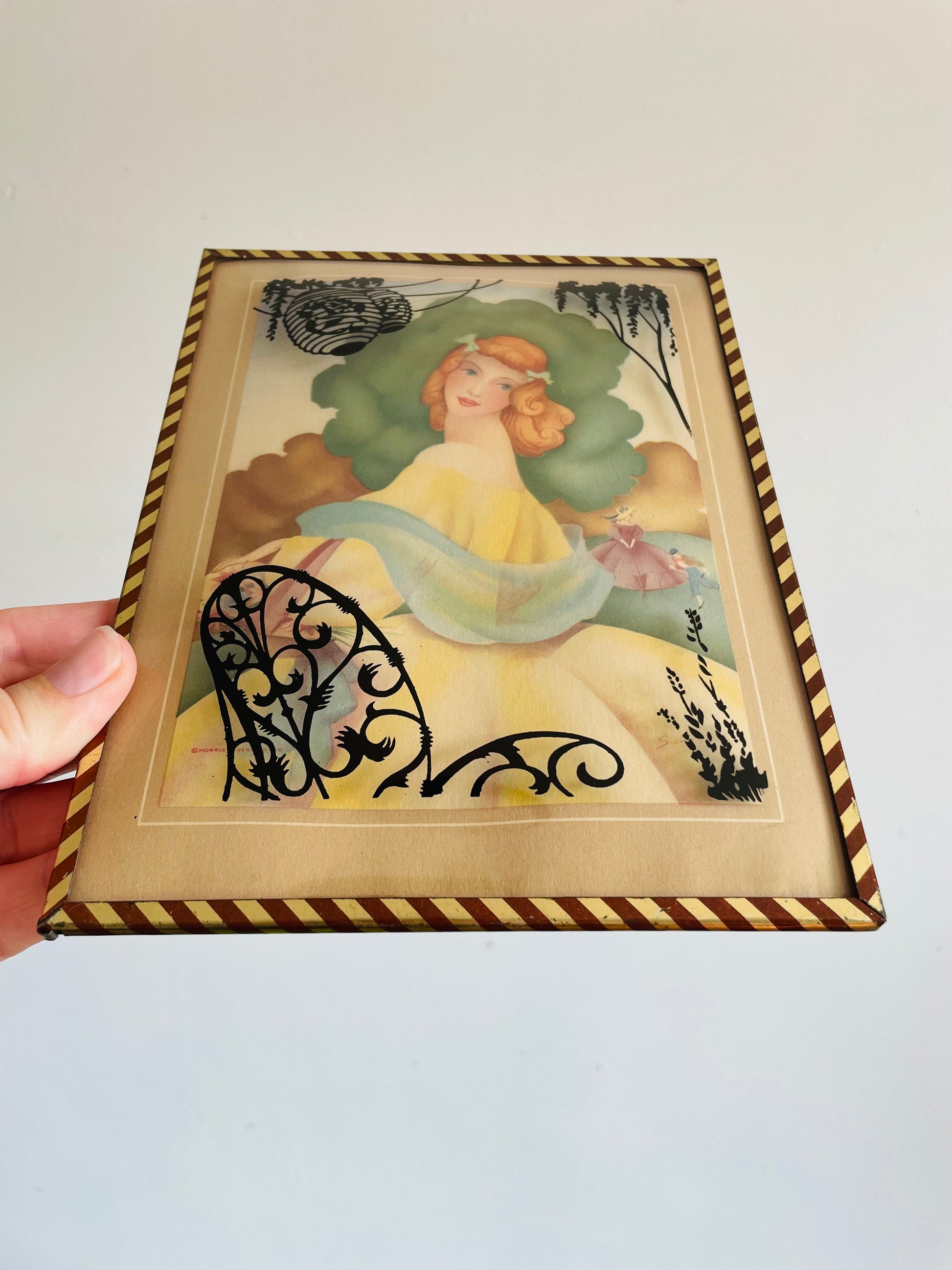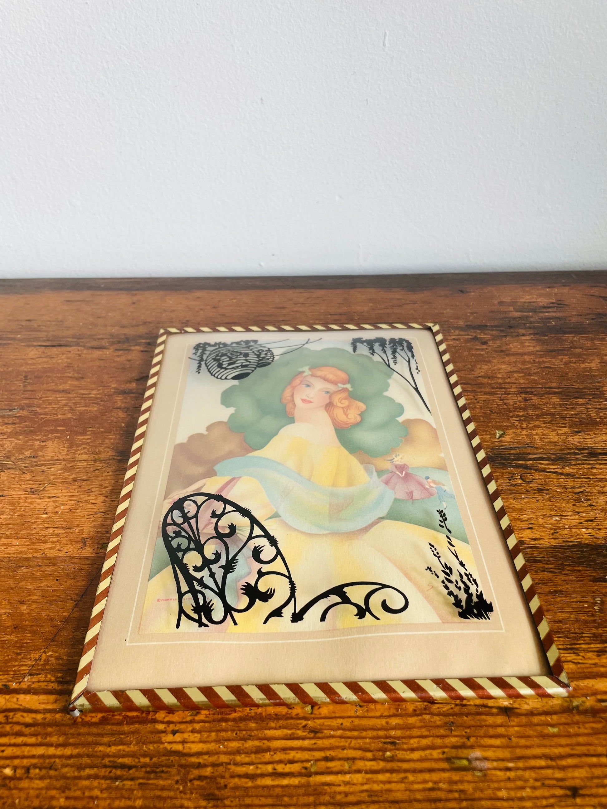 Morris & Bendien Reverse Painted Silhouette Lithograph Picture on Convex Bubble Glass - Woman in Garden
