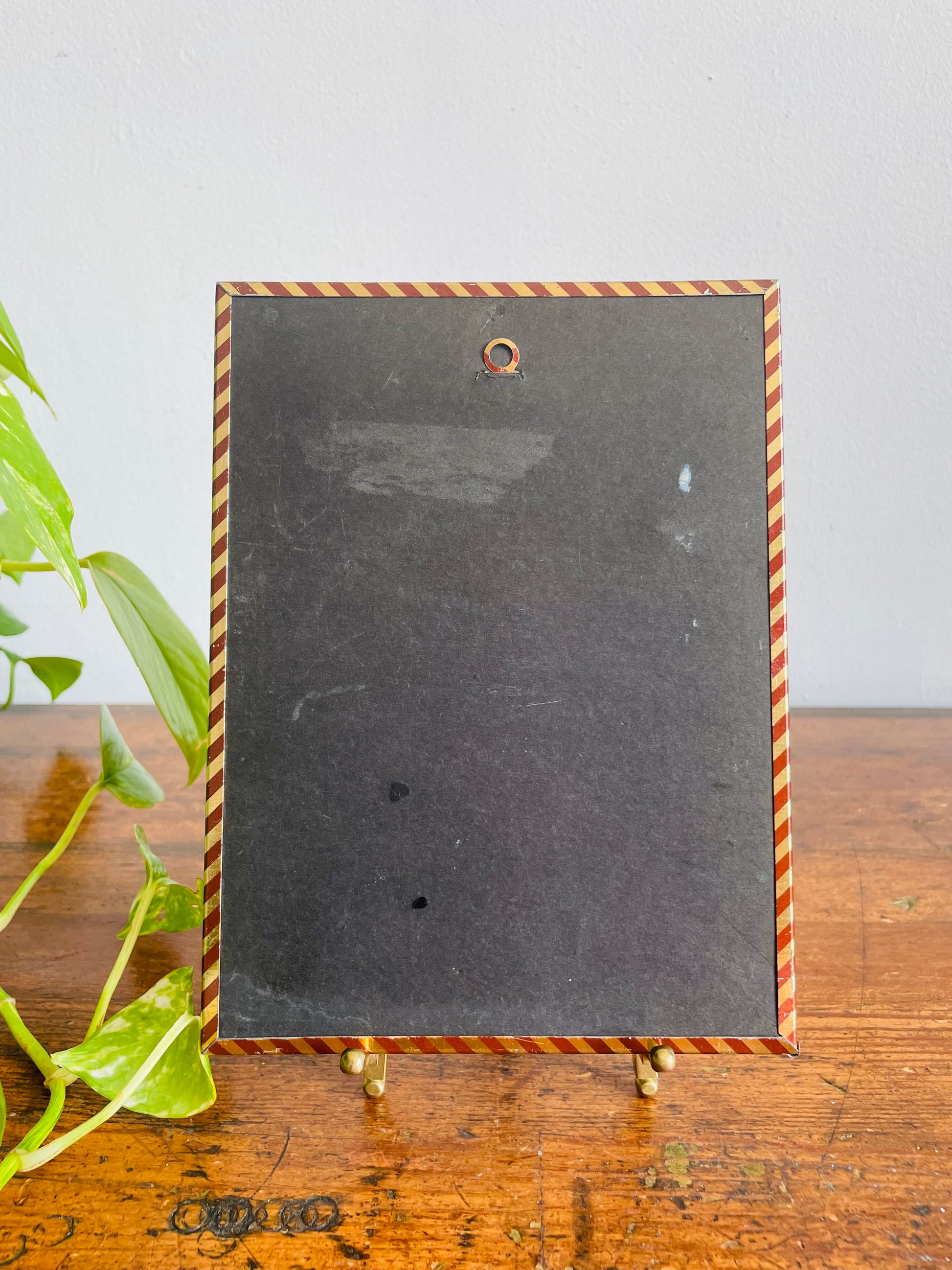 The glass is convex bubble glass so it creates a dome effect. The black images are on the glass which allows for a 3D image with the lithograph print picture background behind. The frame is striped metal.