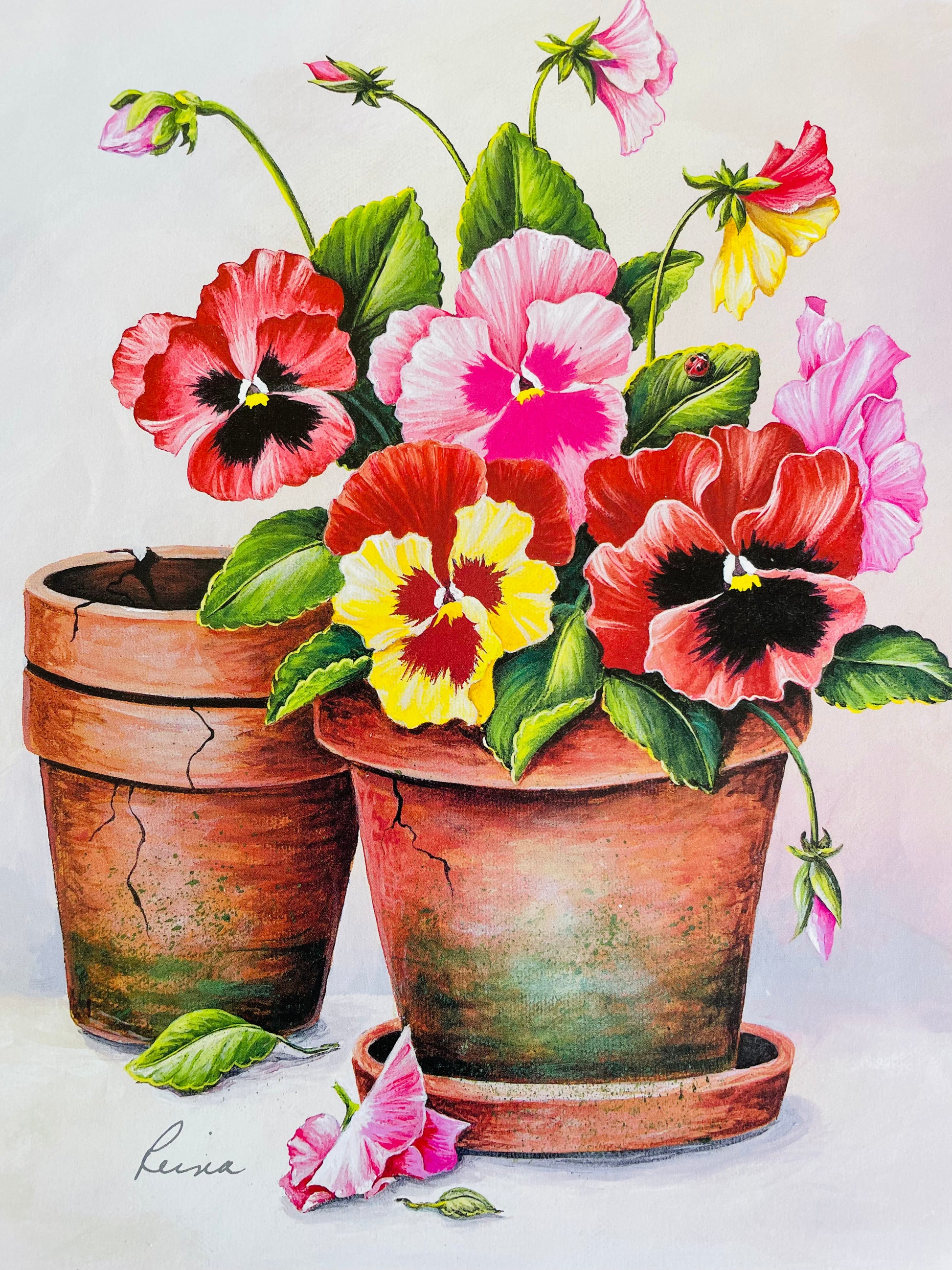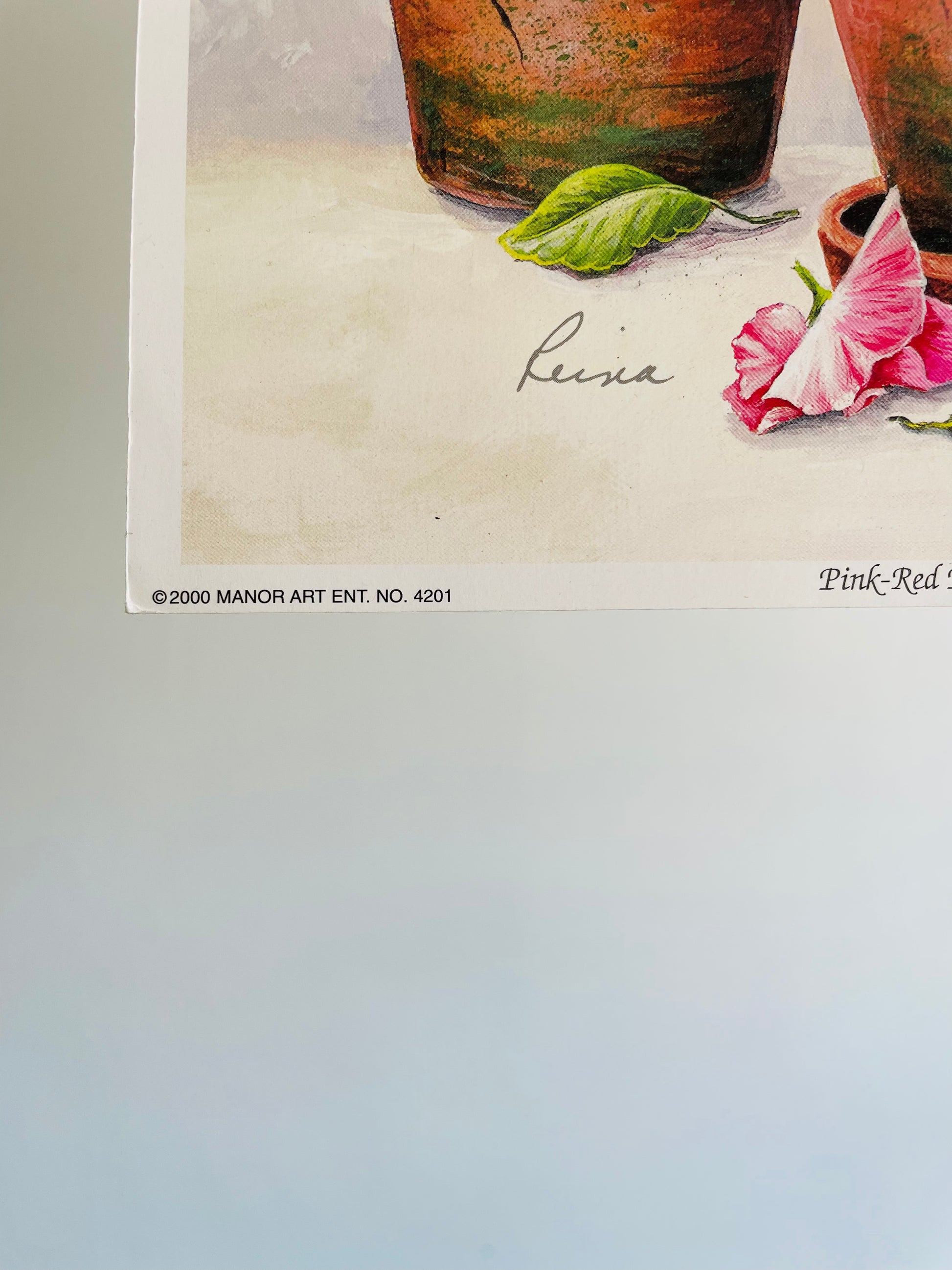 Writing on the print: 2000 Manor Art / Pink-Red Pansies in Pots by Reina / Litho in USA