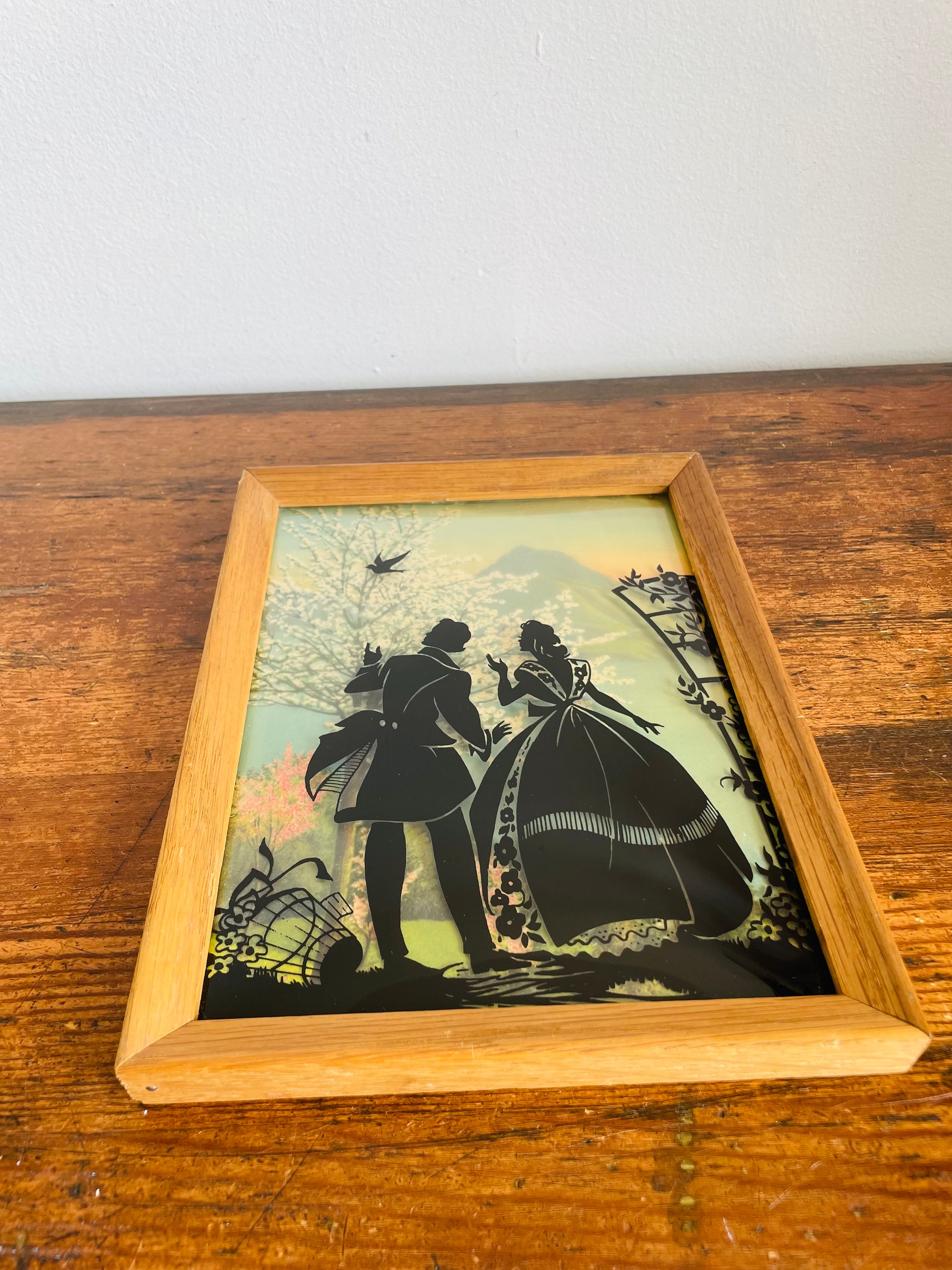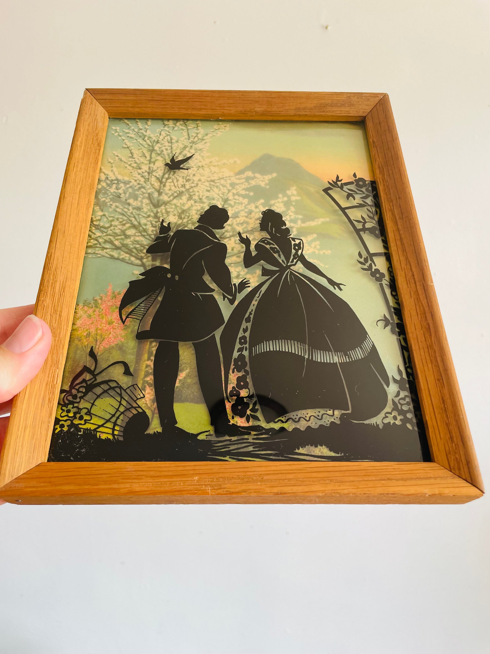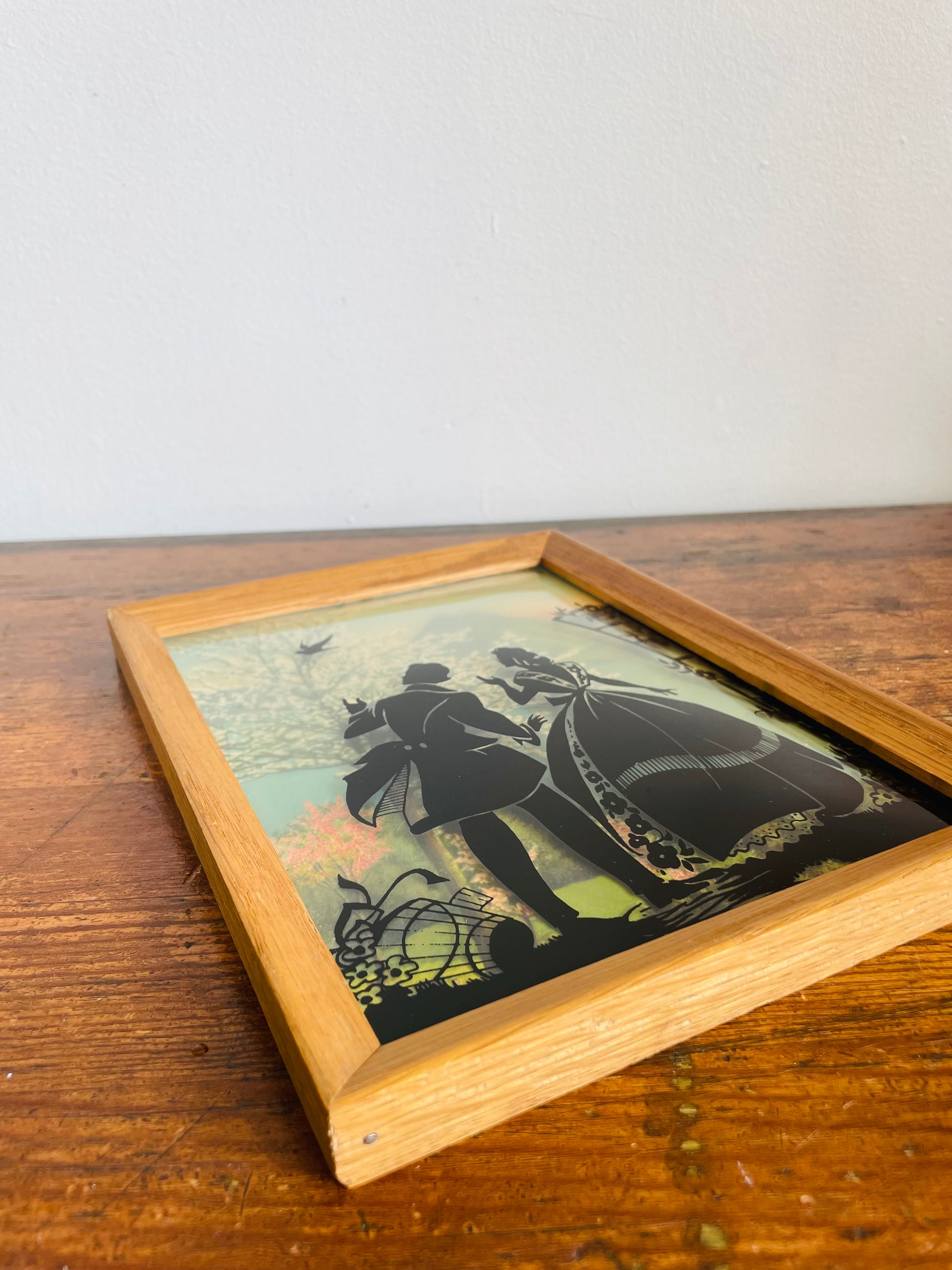 Reverse Painted Silhouette Lithograph Picture on Convex Bubble Glass - Courting Couple in Garden with Flowering Trees & Mountain View