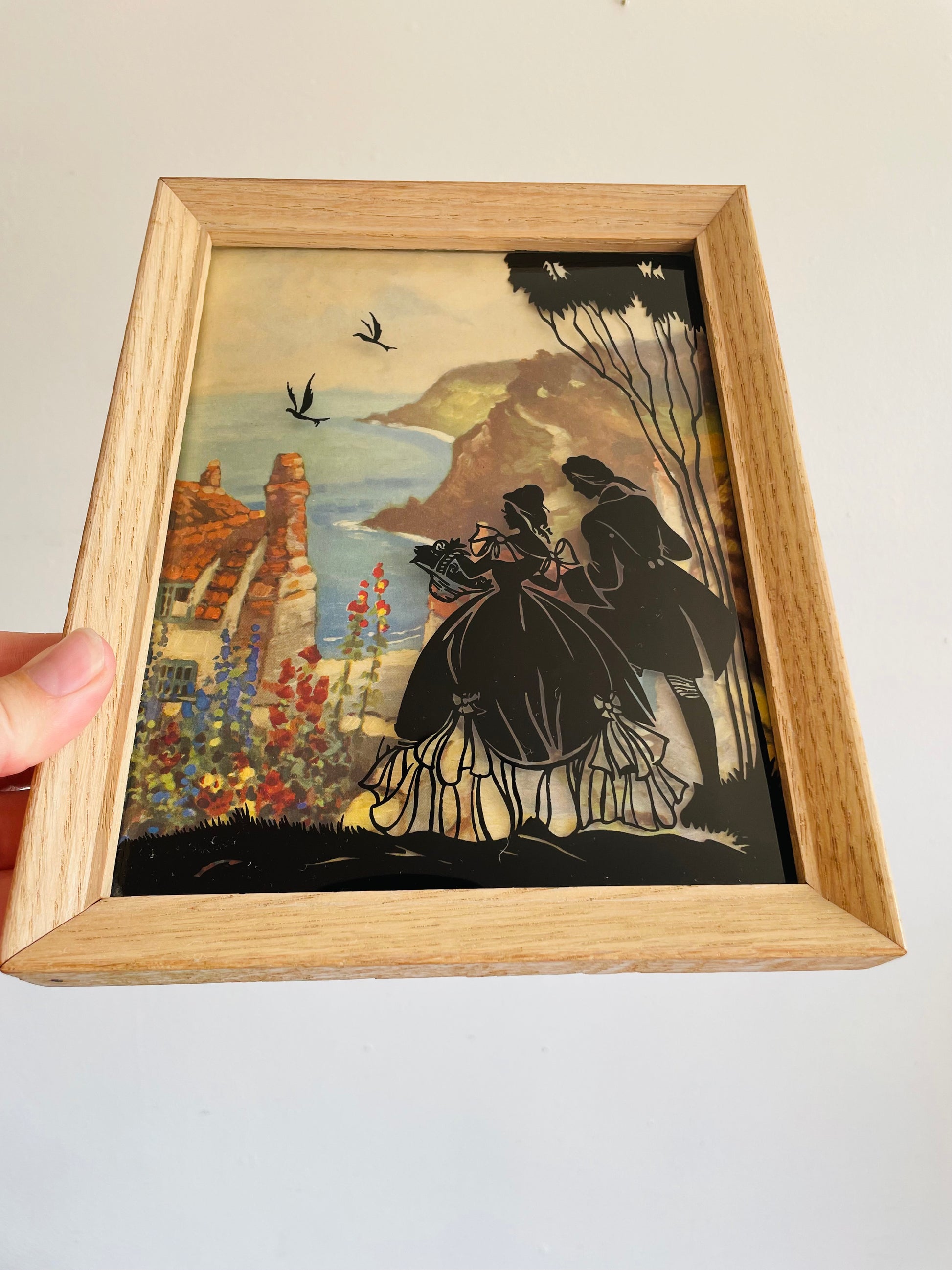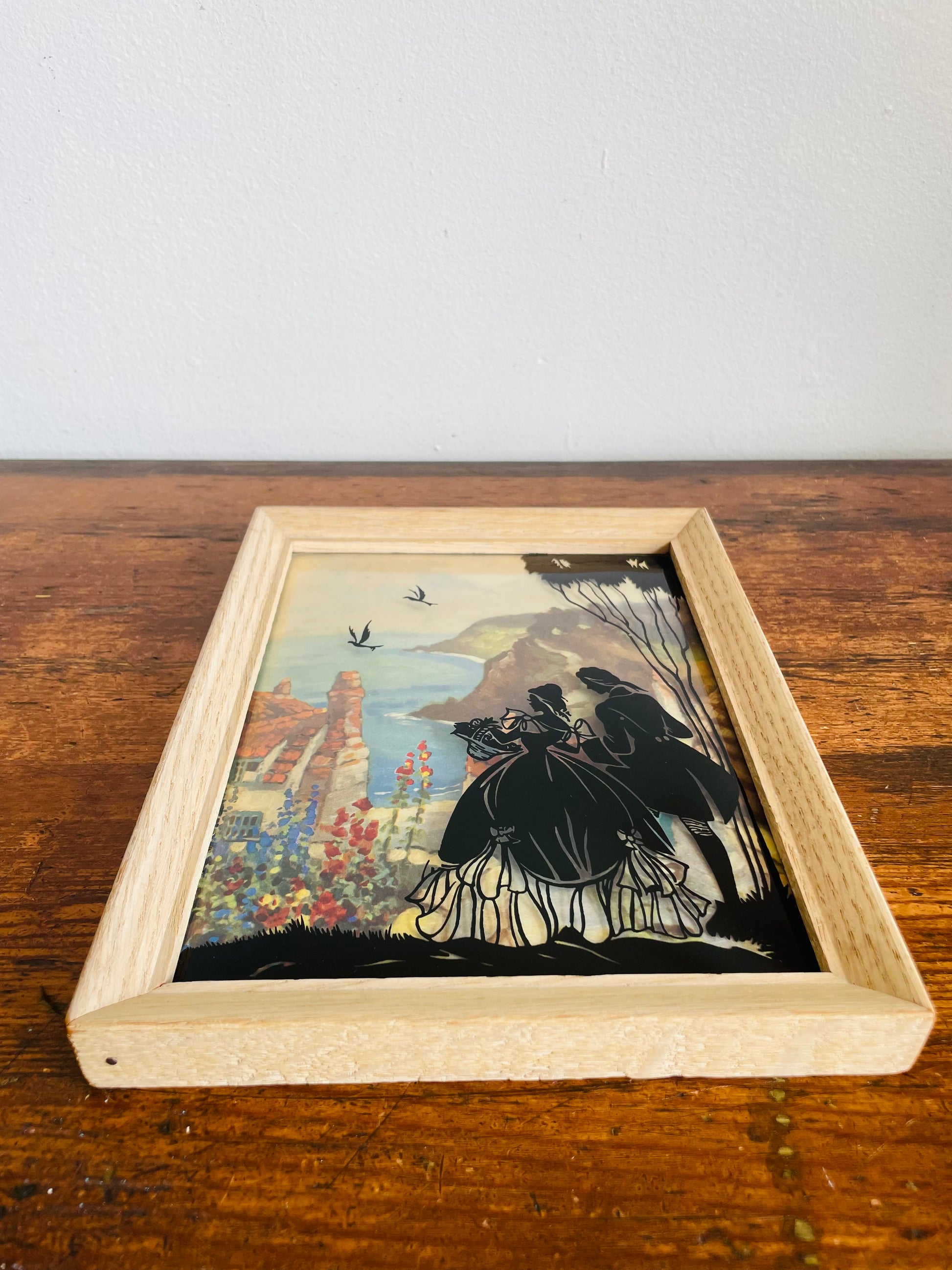 Reverse Painted Silhouette Lithograph Picture on Convex Bubble Glass - Courting Couple on Cliff with Seaside View