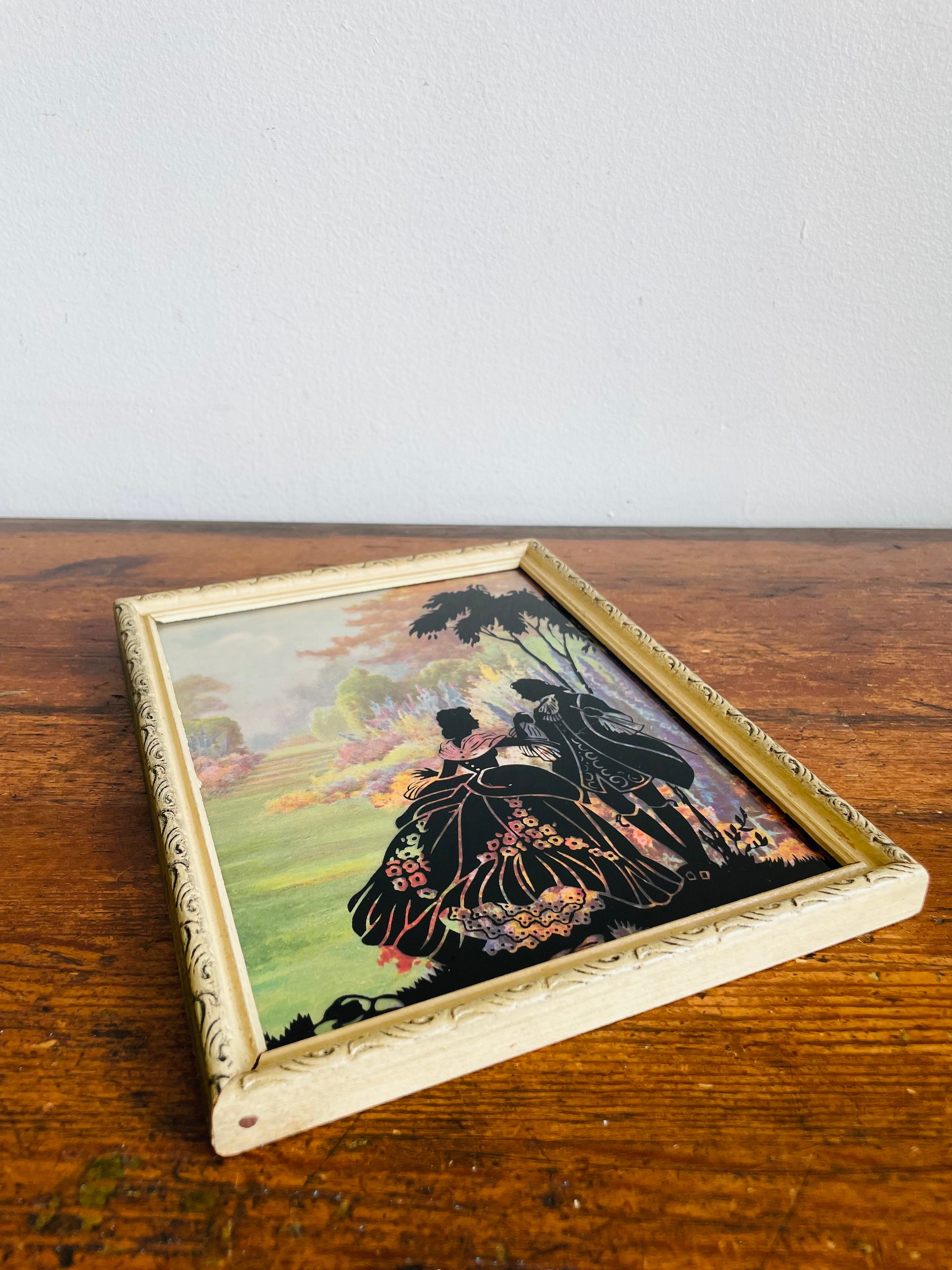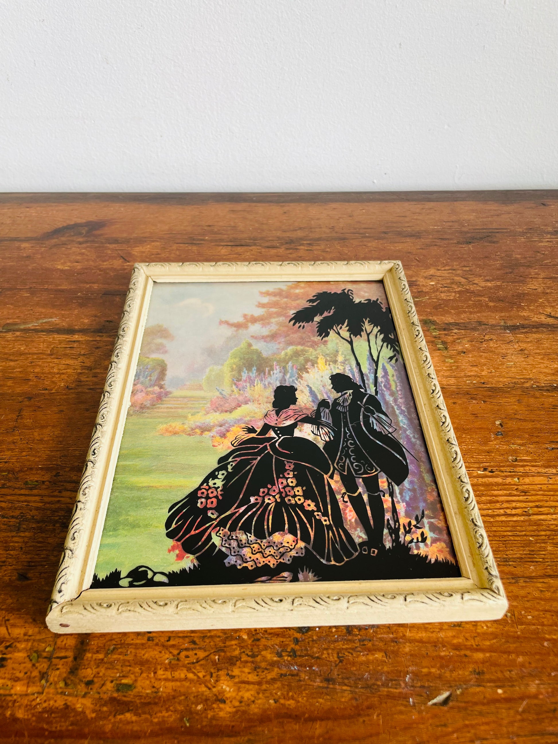 Reverse Painted Silhouette Lithograph Picture on Glass - Courting Couple in Gorgeous Garden