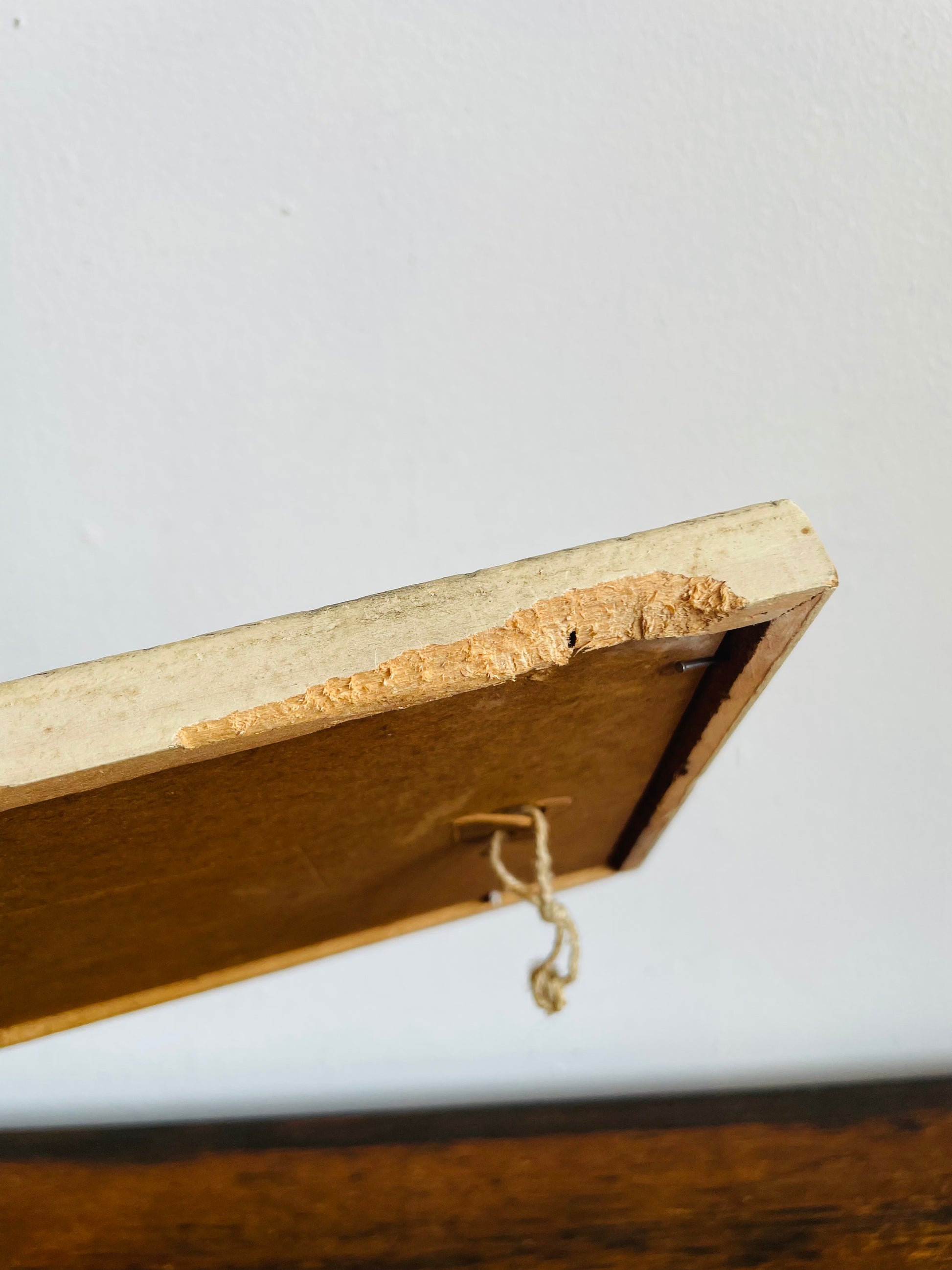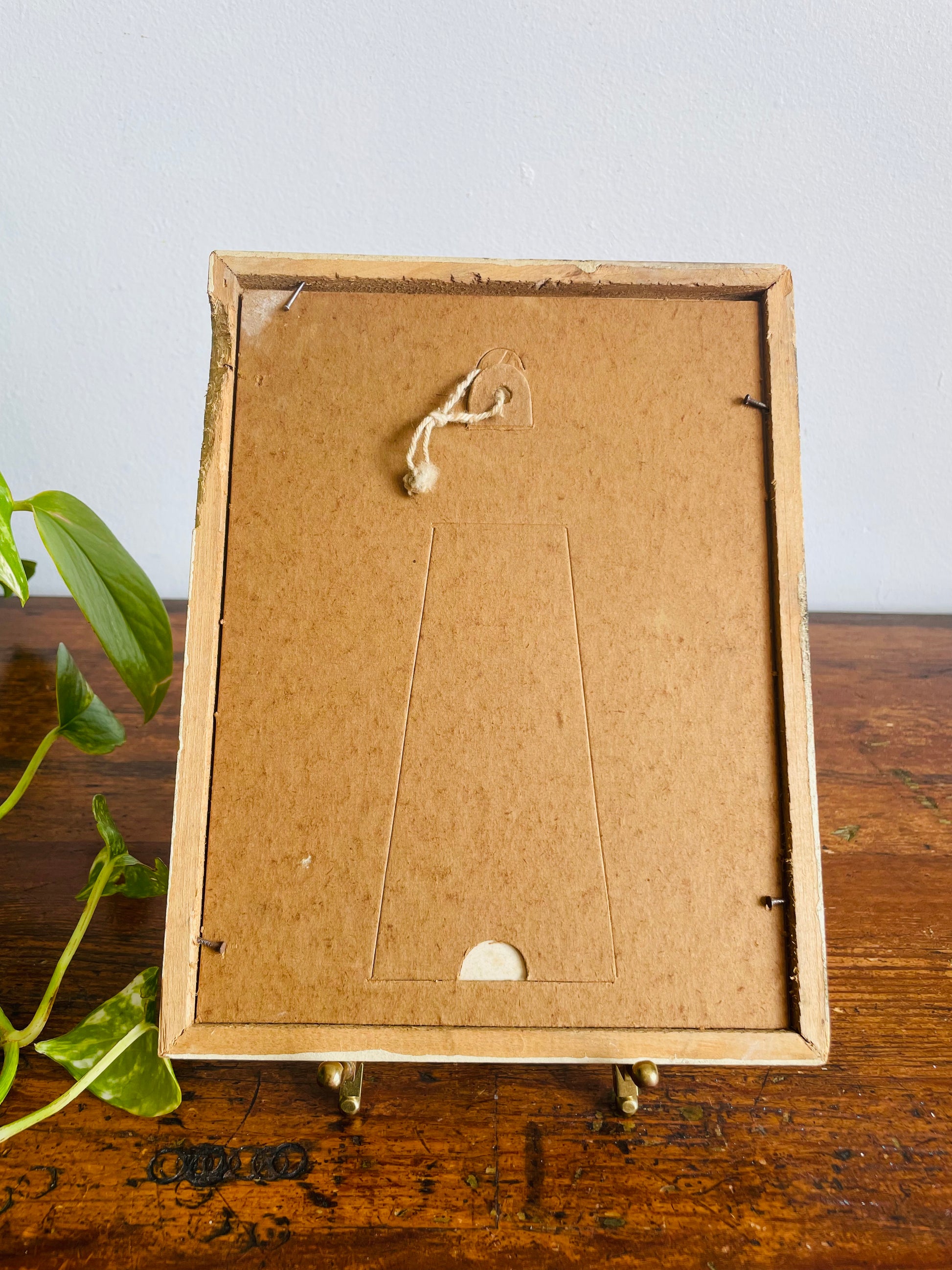 The black images are on the glass which allows for a 3D image with the lithograph print picture background behind. The frame is wood.