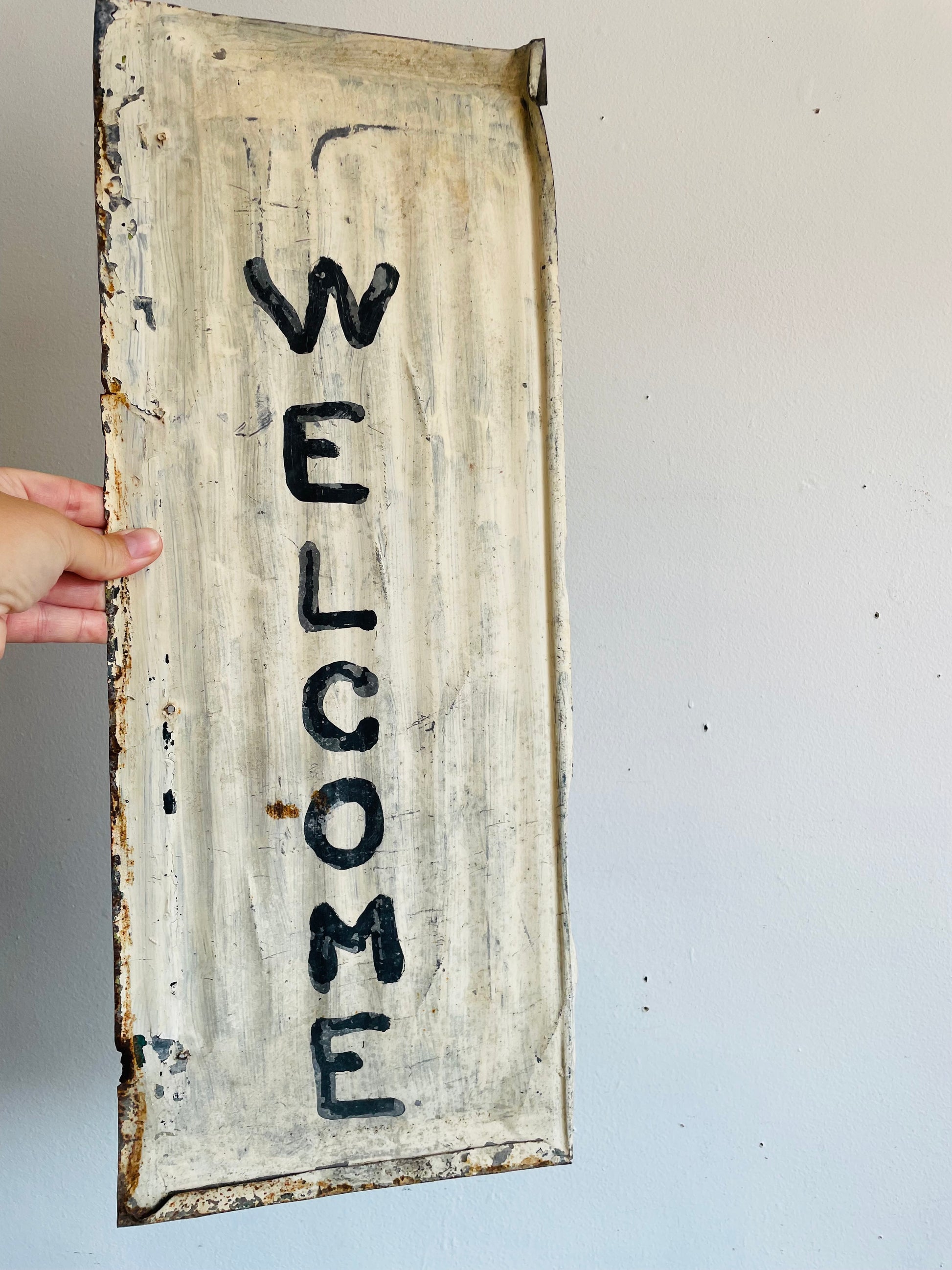 A hand painted welcome sign on metal that was used outside to welcome customers to a country shop. Please note it is in rustic condition.
