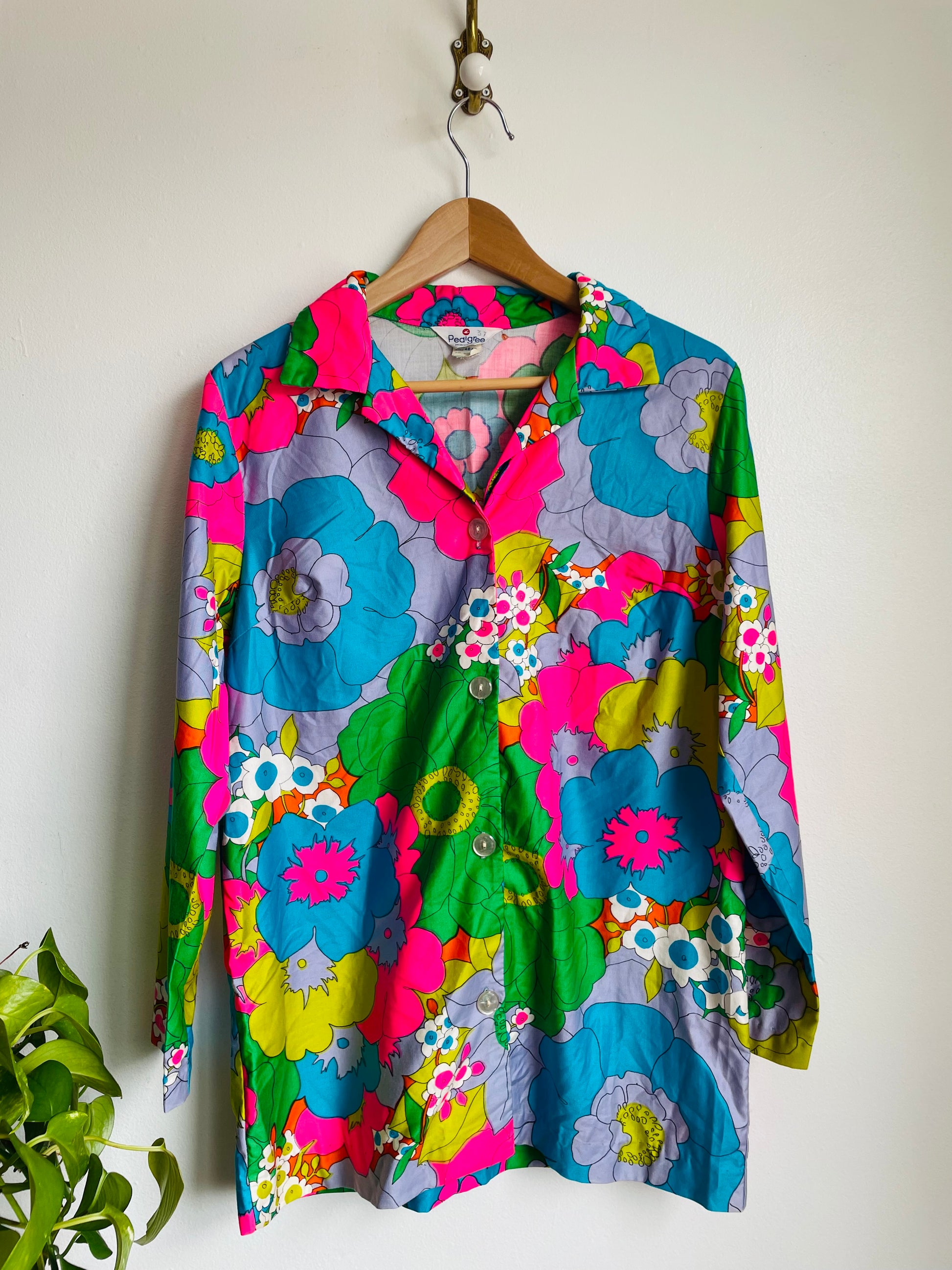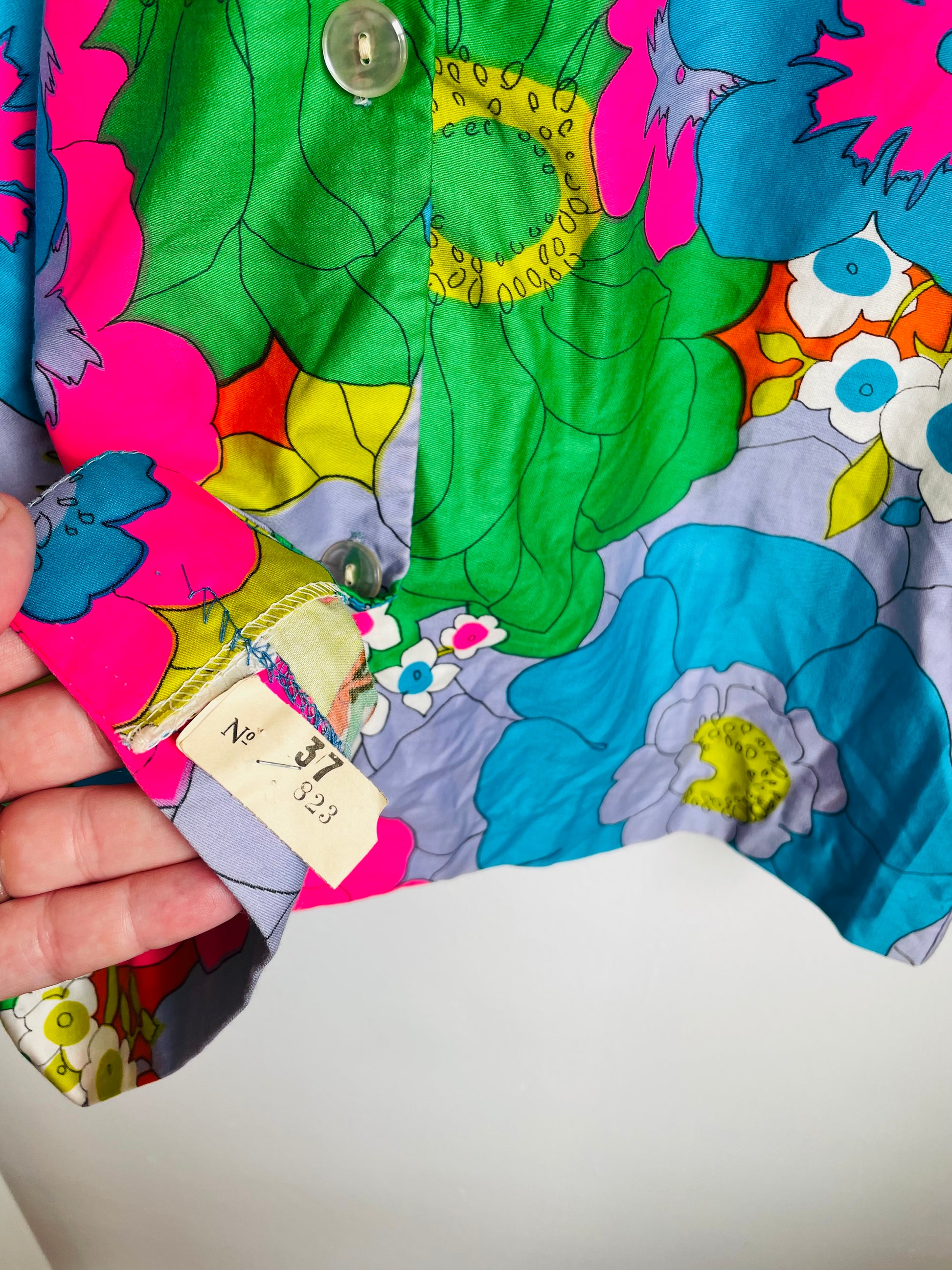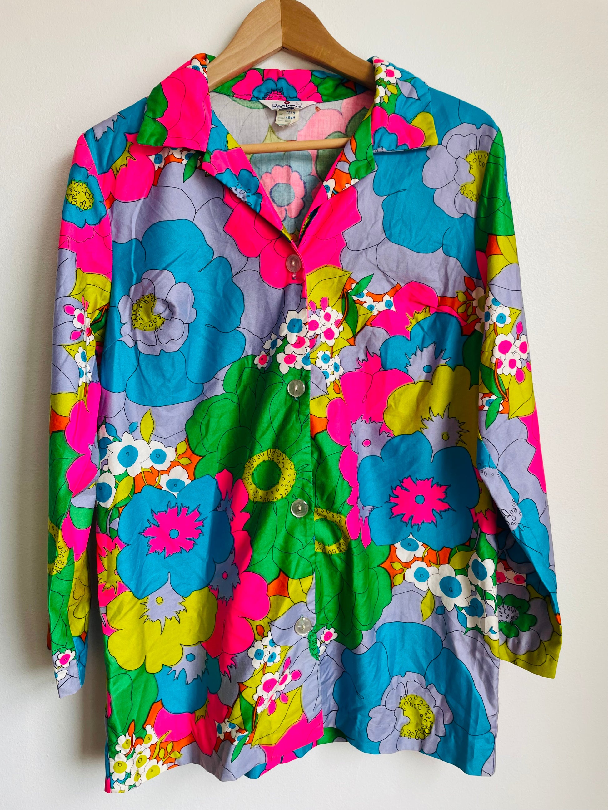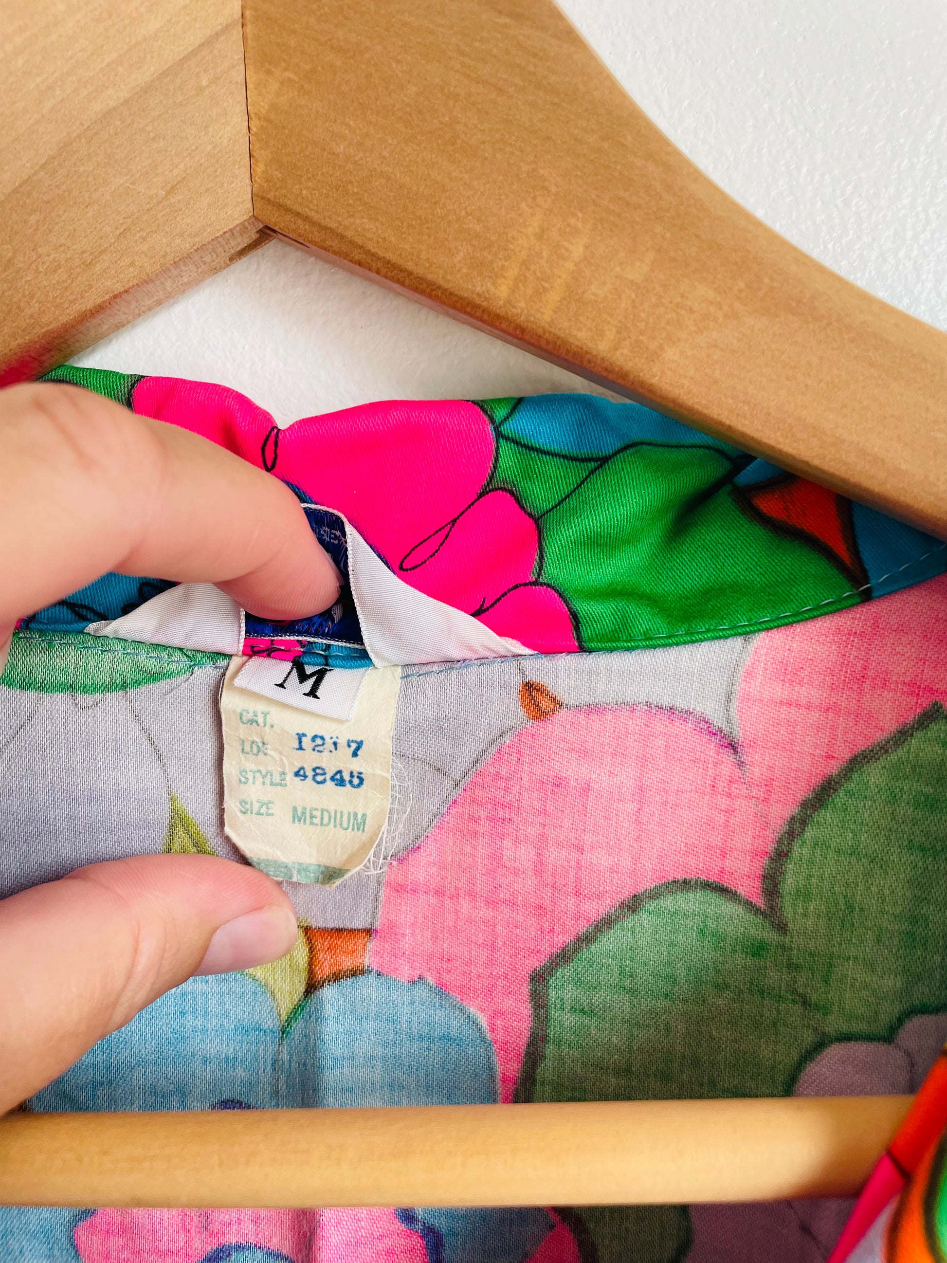 While I believe this originally may have been a pyjama shirt, I also think it would make a great button-up shirt for daytime. When I found the shirt it came with a pair of tiny shorts which made me think it was a pyjama set. The shorts were too worn to sell but the shirt is in great condition and the colours are vibrant!