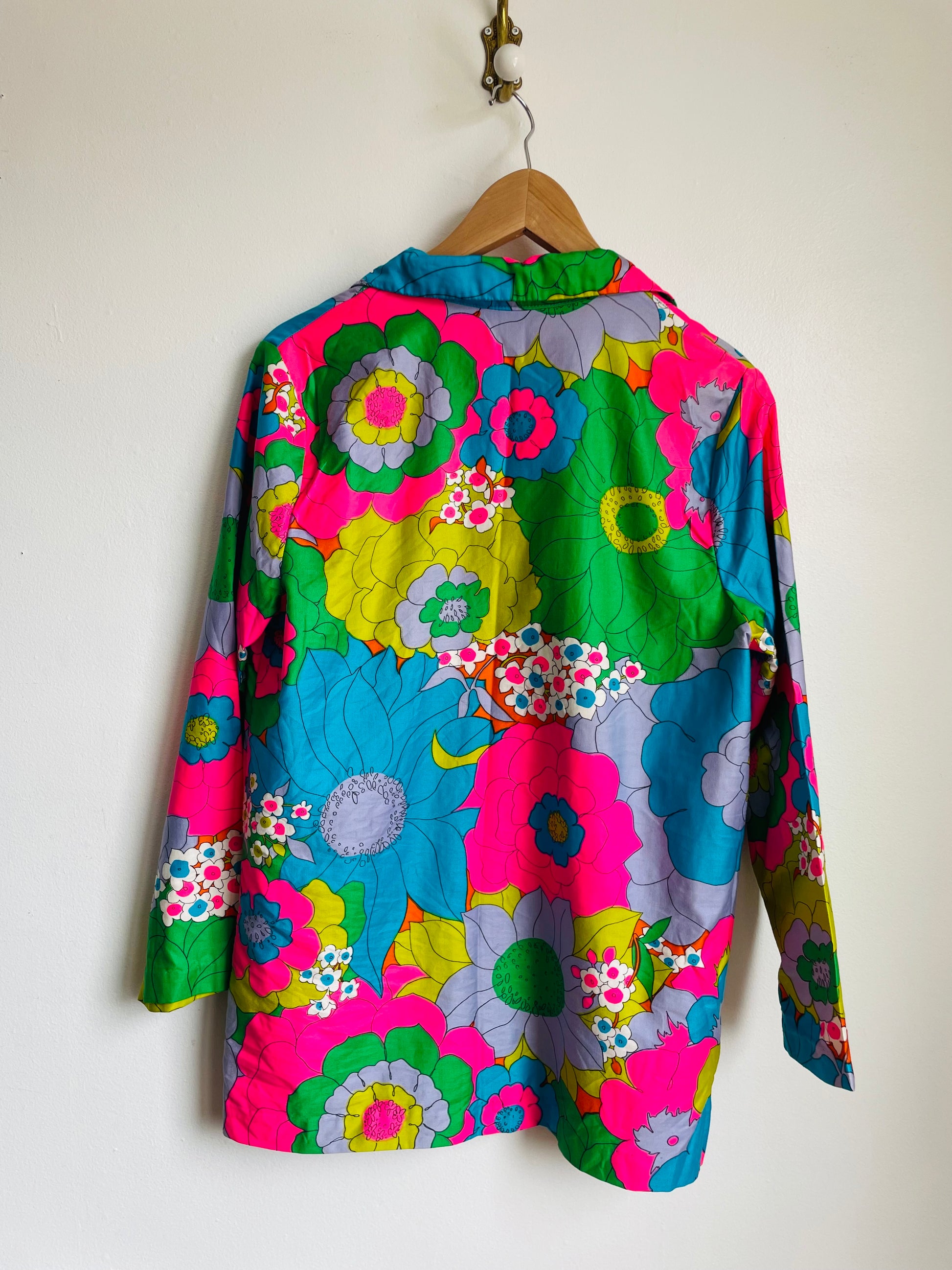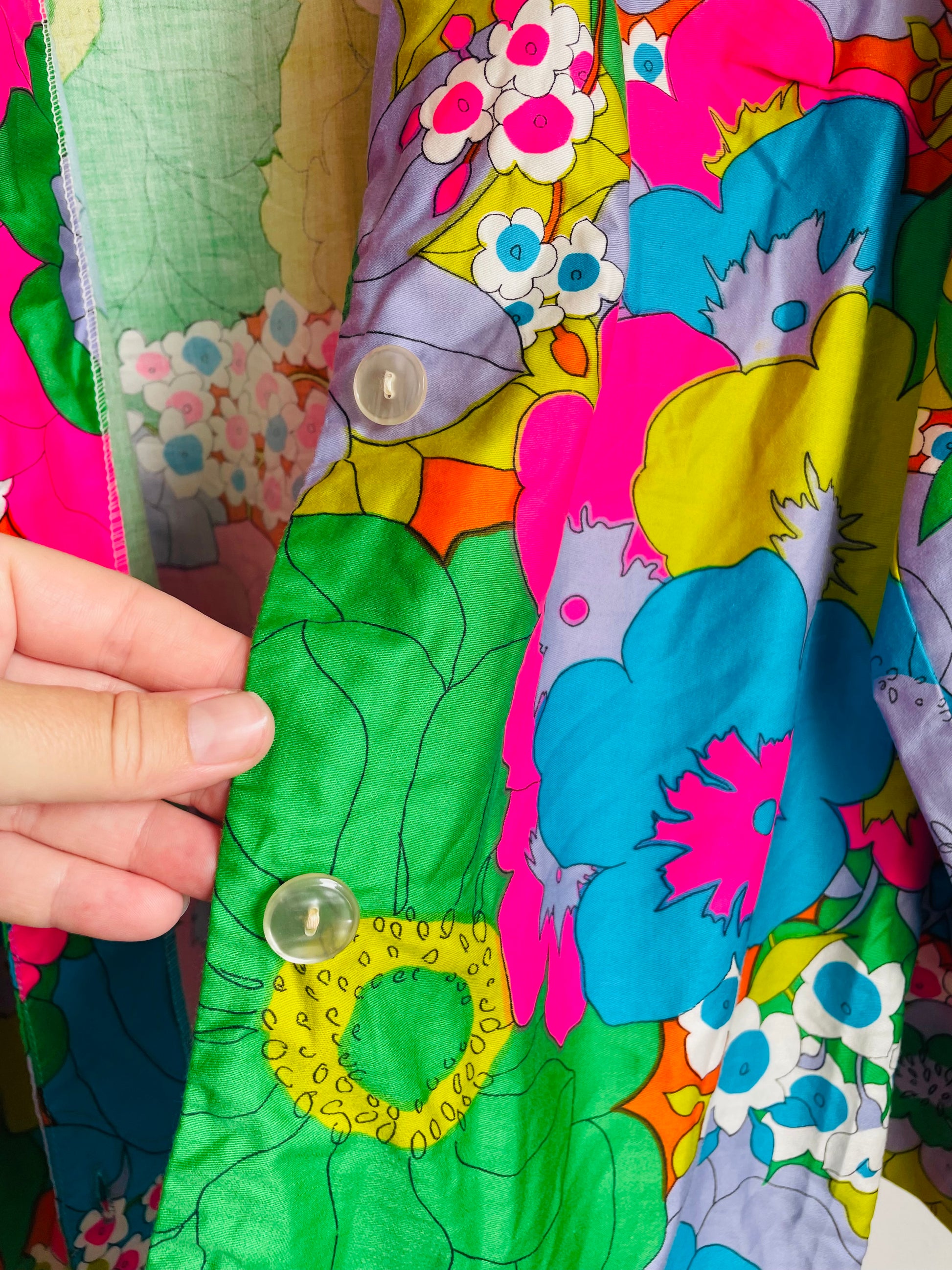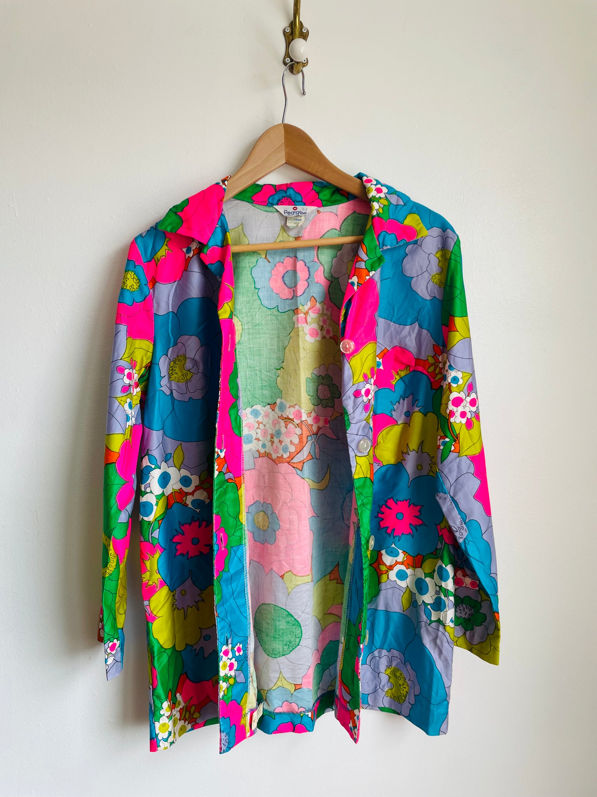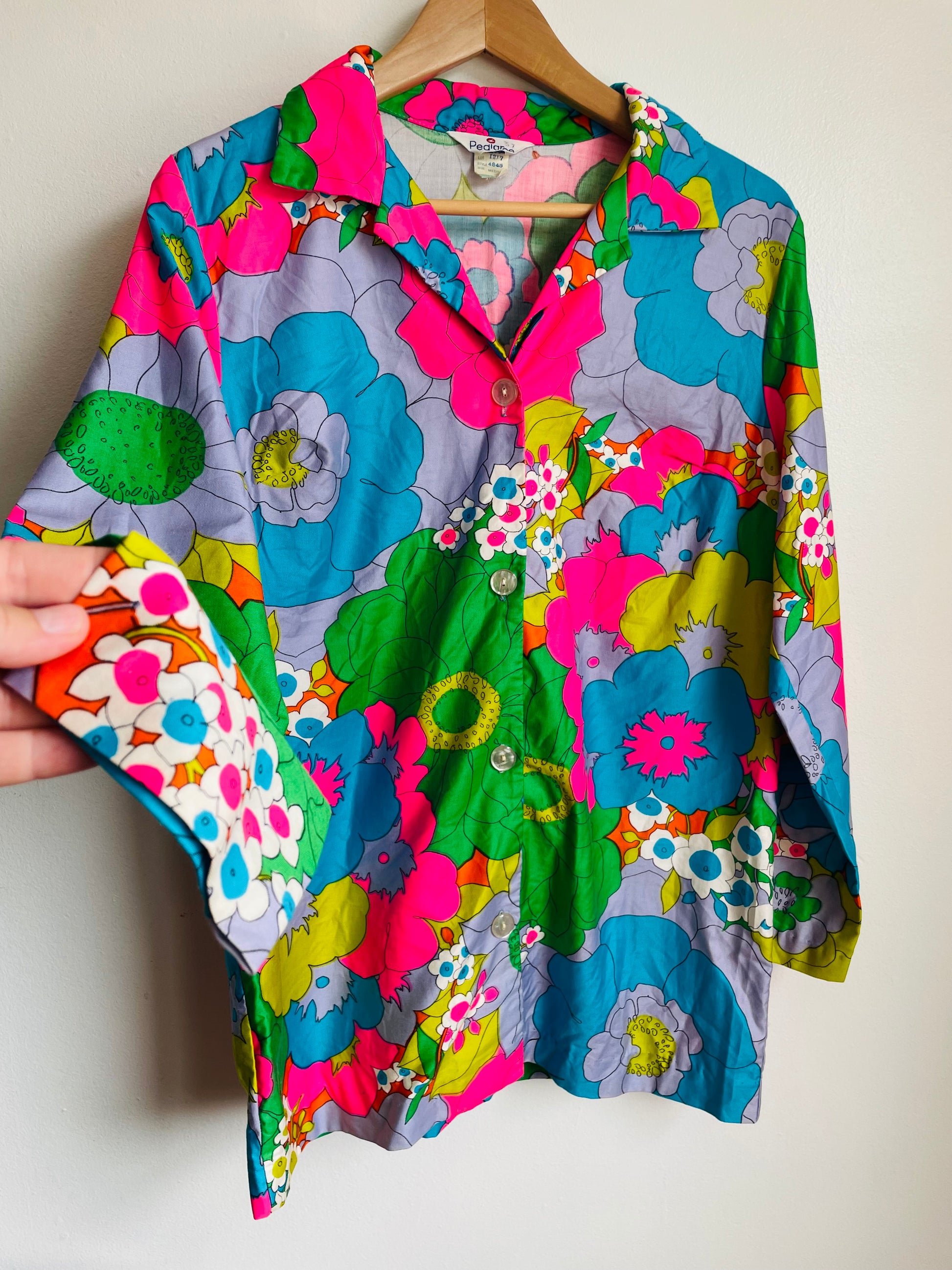 While I believe this originally may have been a pyjama shirt, I also think it would make a great button-up shirt for daytime. When I found the shirt it came with a pair of tiny shorts which made me think it was a pyjama set. The shorts were too worn to sell but the shirt is in great condition and the colours are vibrant!