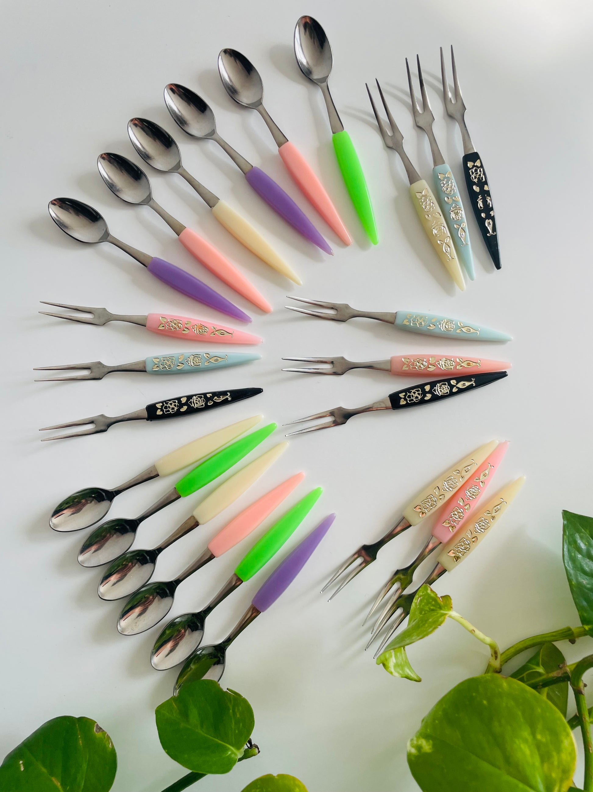Vintage 1960s Fun Collection of Mini Appetizer Hors d'oeuvres Cocktail Forks & Spoons in Pastel & Neon Colours - Set of 24 Pieces - Stainless Japan