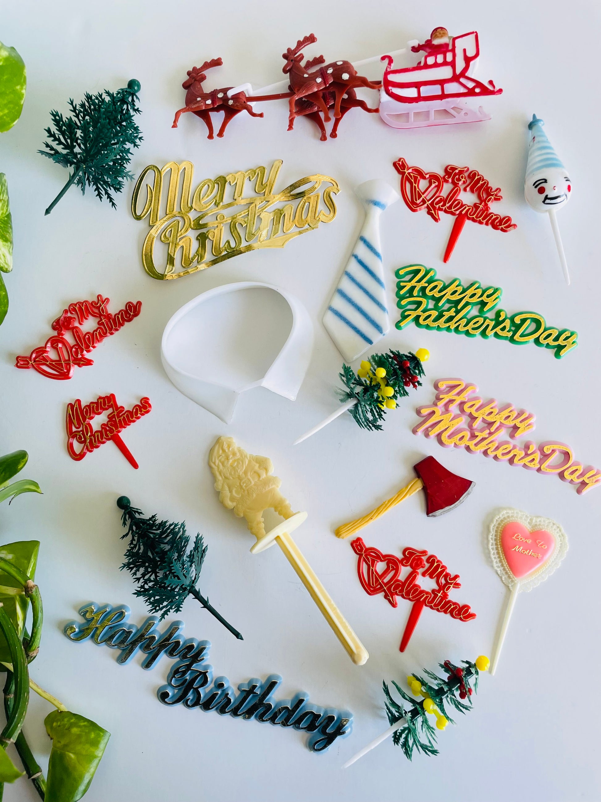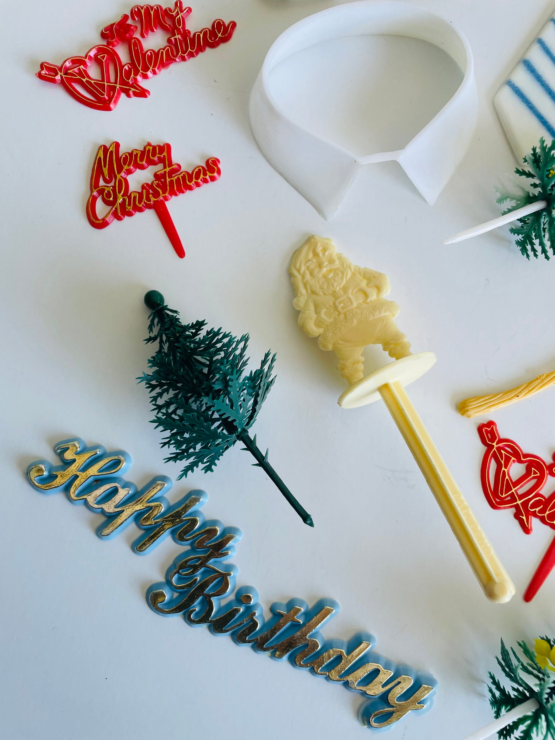 A set of 19 vintage cake toppers that can be reused time and time again! Everything is made from plastic except for the gold script Merry Christmas which is more of a foil fabric type of material.