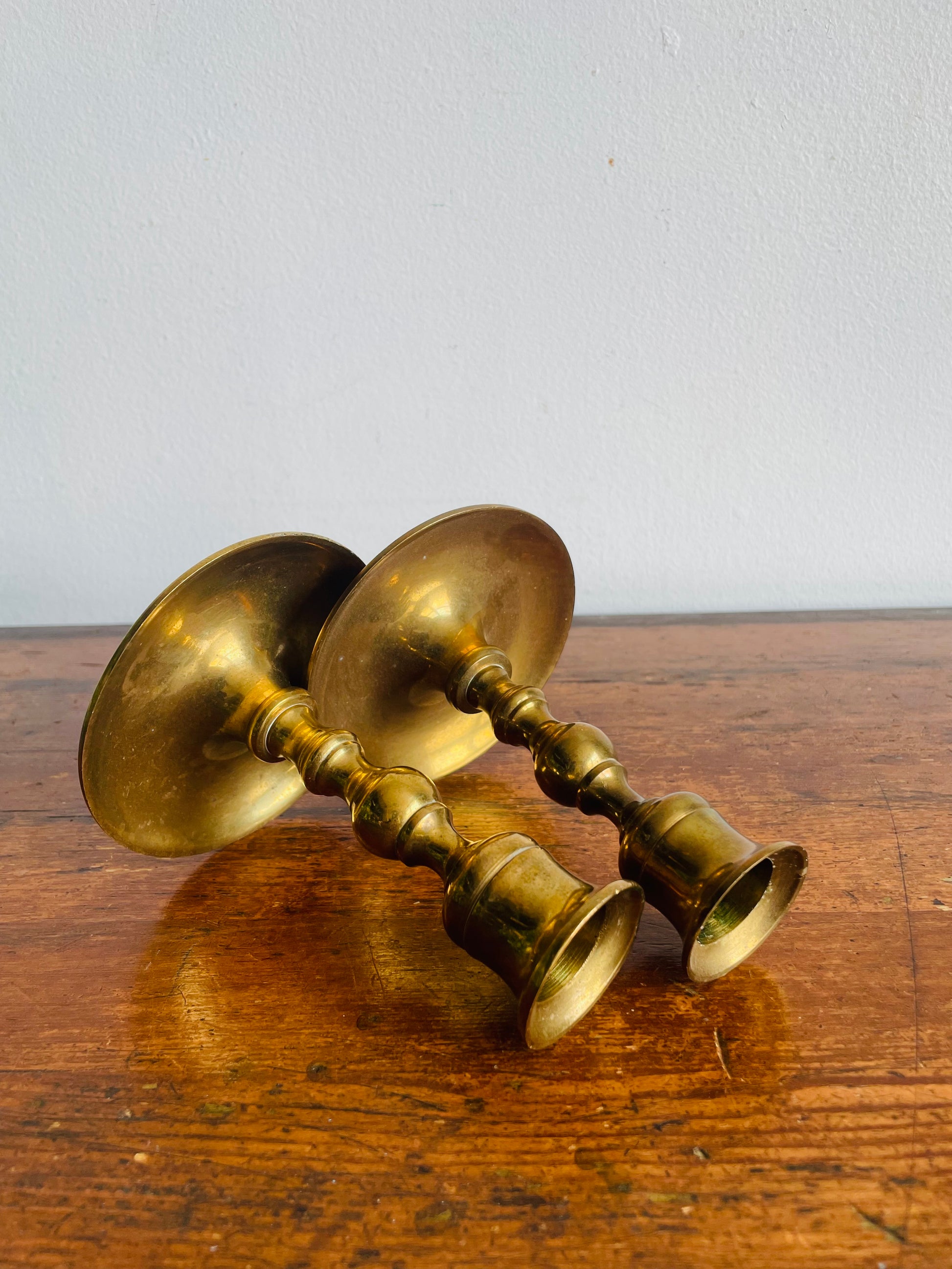 Vintage Heavy & Solid Brass Candle Holders with Spindle Shape & Curved Bases - Can Unscrew - Set of 2