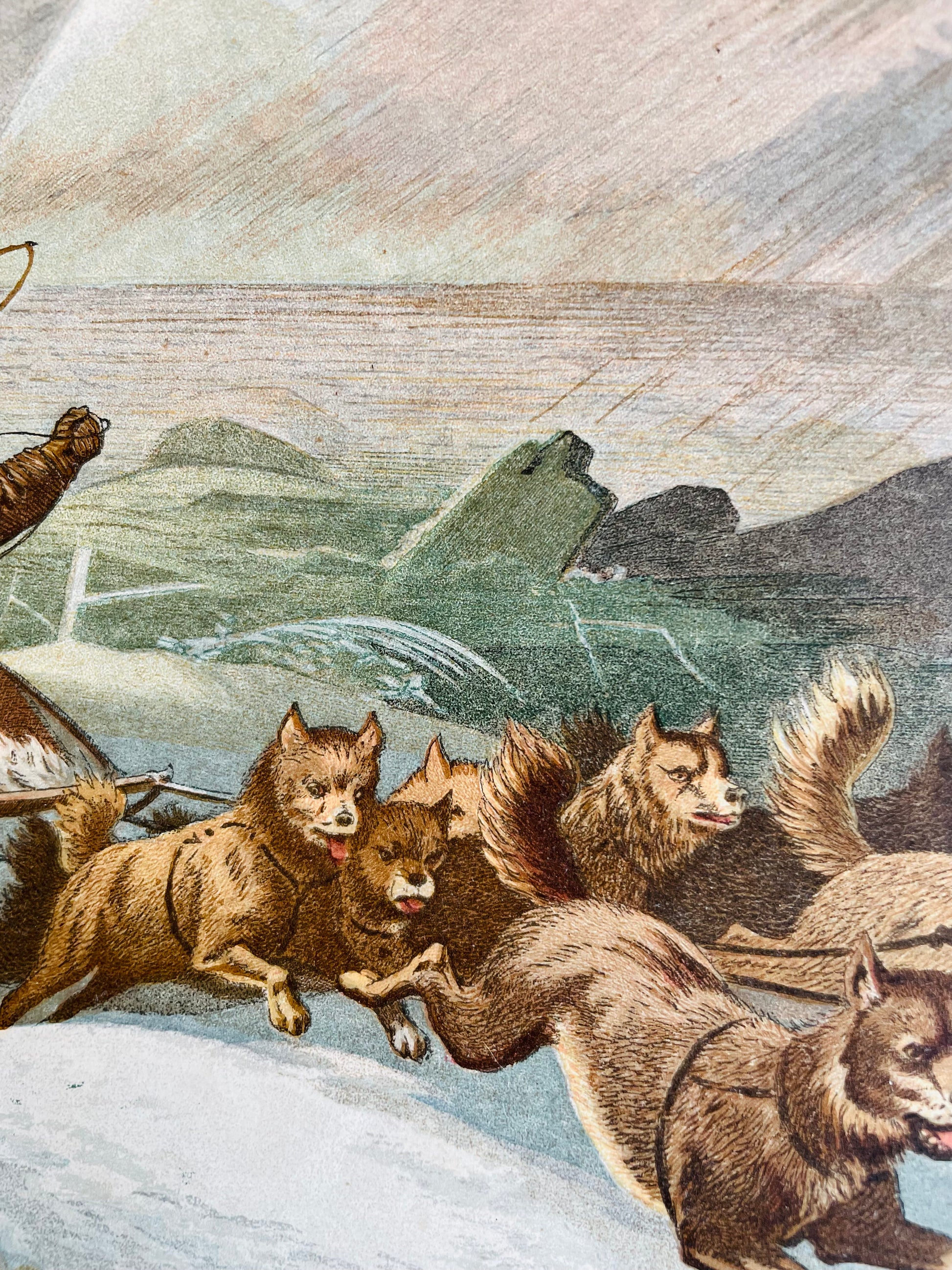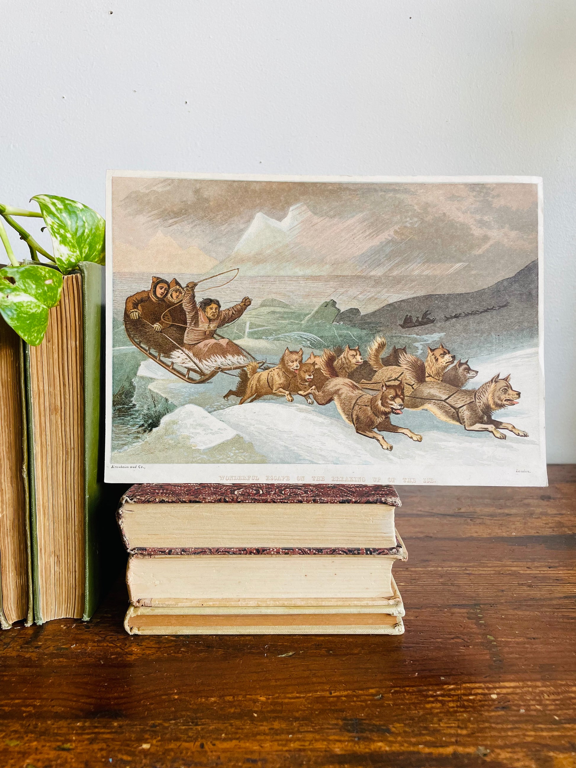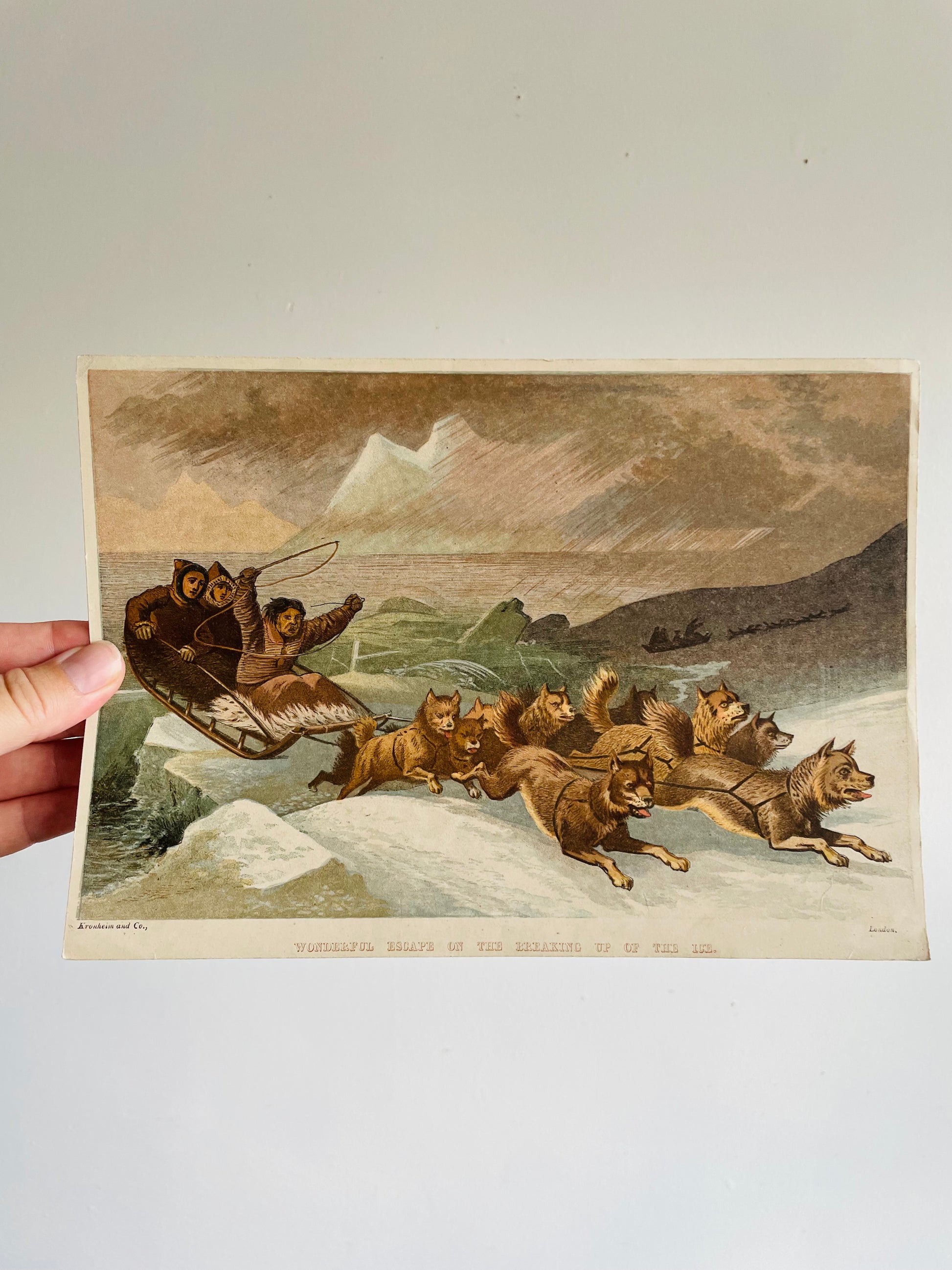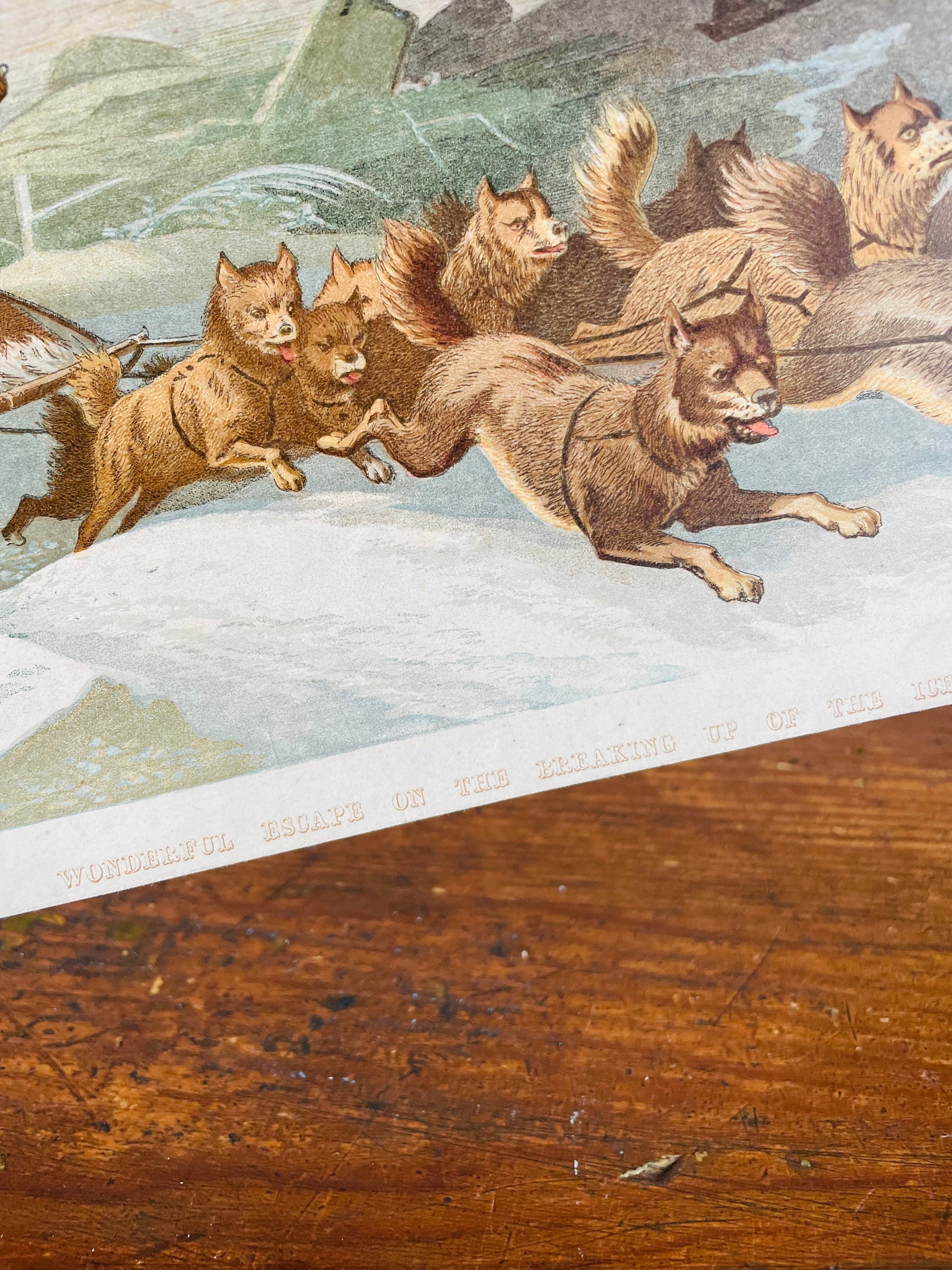 Vintage Lithograph Print Picture - "Wonderful Escape on the Breaking Up of the Ice" with Dog Sled Team in Arctic - Kronheim and Co., London