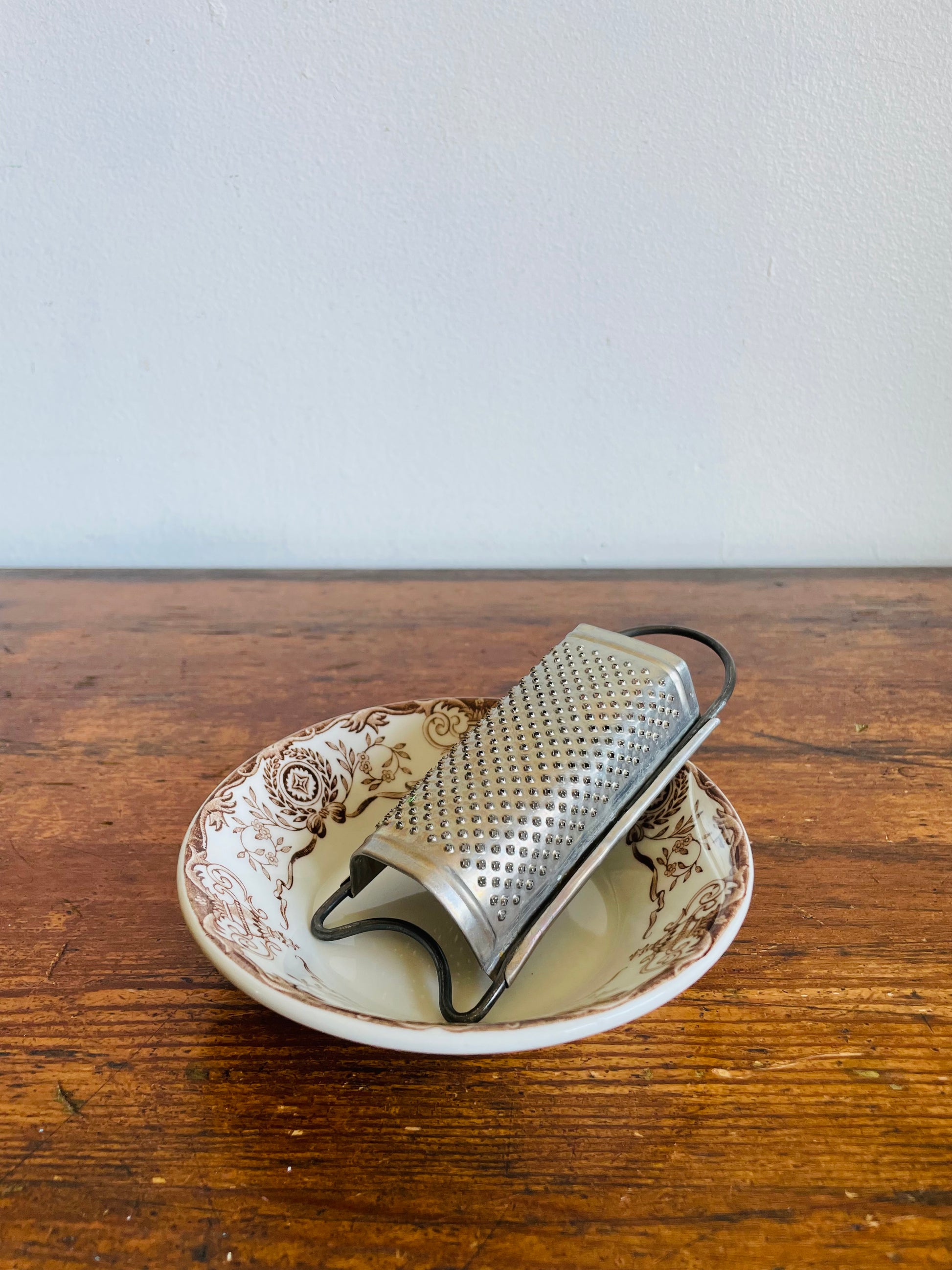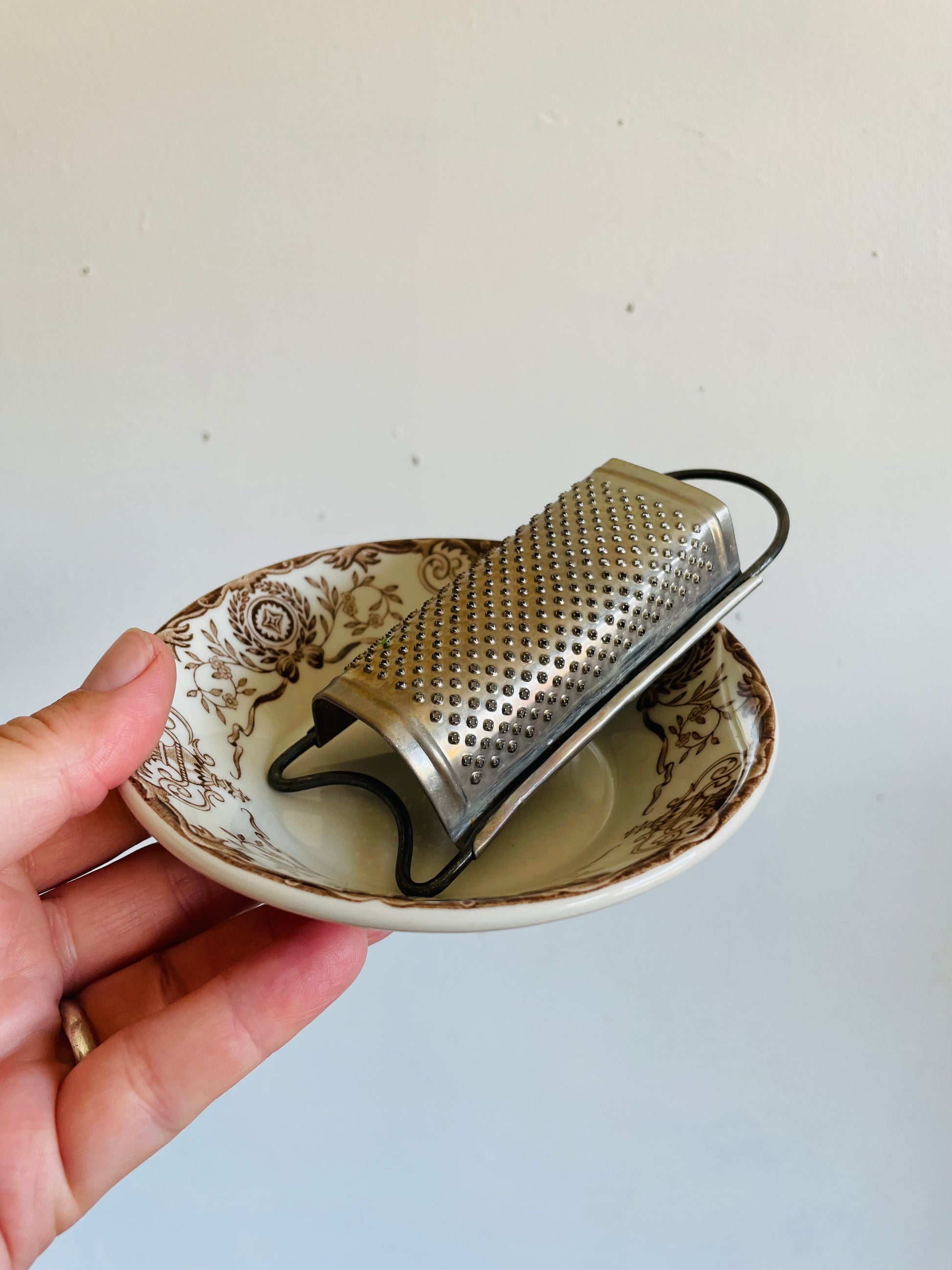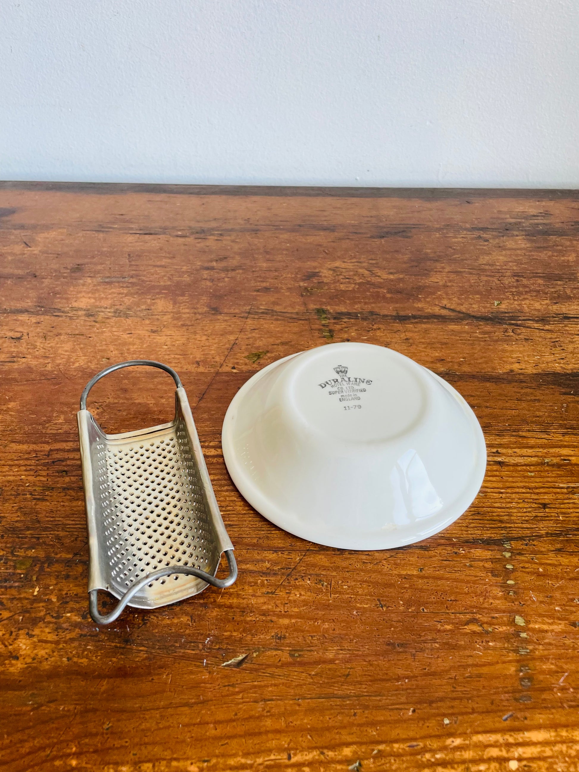 I have paired these two pieces together but they don’t originally go together. I just thought the grater would be nice for grating nutmeg or zesting fruit and then you could catch the grated pieces in the bowl. Use them together or separately.
