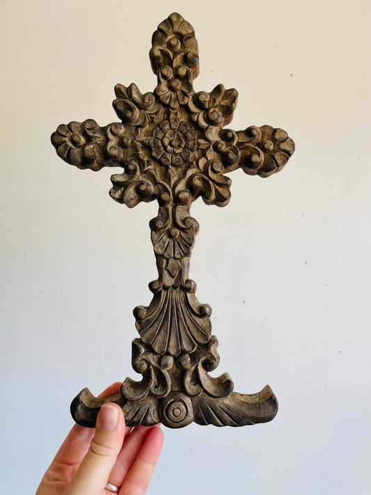 Vintage Carved Wood Wall Hanging Cross with Ornate Floral Design
