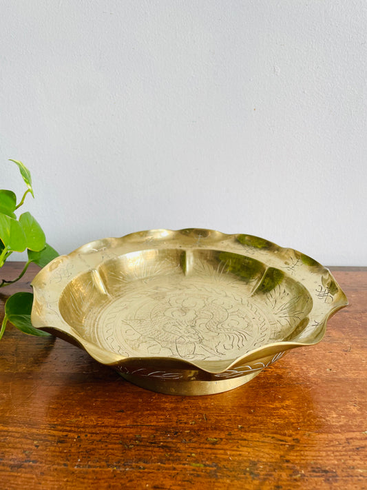 Vintage Solid Chinese Brass Footed Bowl with Etched Dragon Design