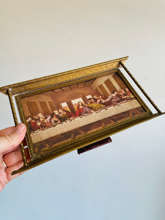 Vintage Unique Solid Brass Picture Frame with The Last Supper Religious Print Inside - Print Can Be Removed & Replaced - Easel Backing & Hooks for Hanging