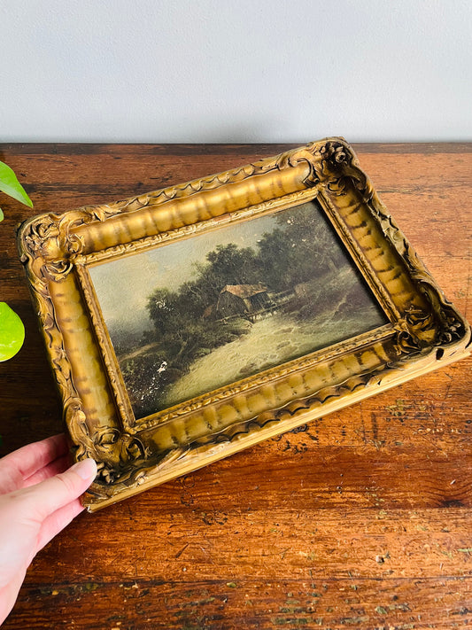 Antique Frank G. Hart's Oil Painting Facsimile Picture in Ornate Gold Frame - "The Old Watermill"
