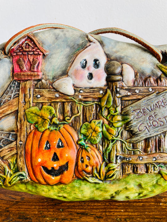 Vintage Hand Painted Ceramic Beware of Ghost Sign with Leather Rope for Hanging - Jack-o-Lantern Pumpkins & Ghosts - Haunted Halloween Spooky Decor