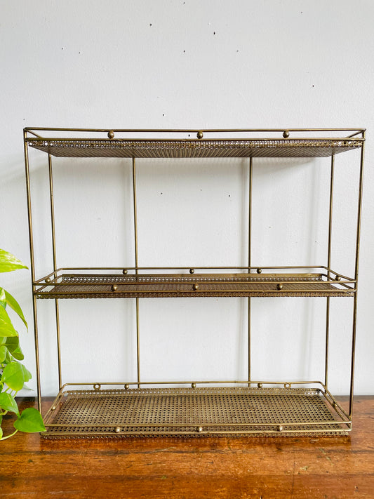 Vintage Gold Toned Metal & Brass Wall Hanging Shelf with Openwork Grill Design & Raised Edges - 3 Shelves- No Shipping