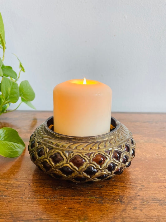 Vintage Amber Glass Bowl Dish Encased in Brass Latticework - Great Holder for Matches, Q-tips, Candle Holder, Etc.
