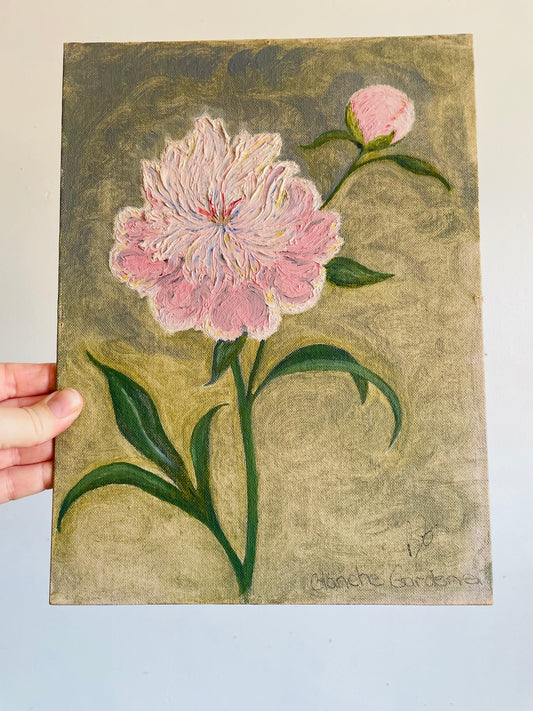 Vintage Original Art Painting Picture on Board of Pink Peony Flower - Artist Signed