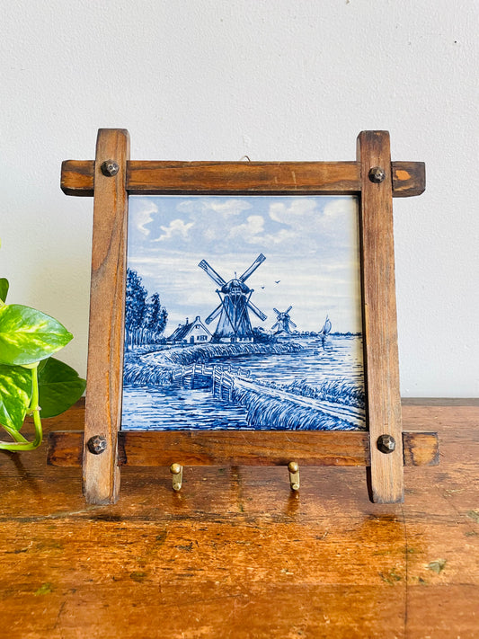 Vintage Delft Blue Hand-Painted Dutch Windmill Scene Wall Hanging Tile in Wood Frame - Made in Holland