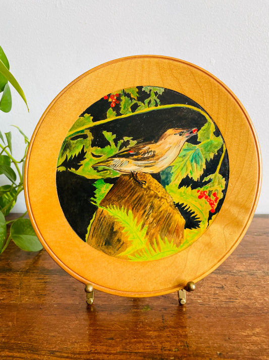 Vintage Round Original Art Painting of Bird in Foliage with Berries on Wood