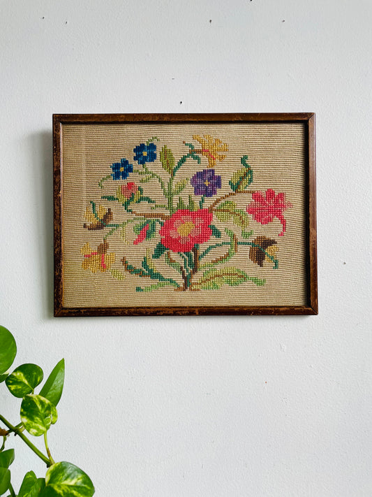 Vintage / Possibly Antique Needlepoint Embroidery Picture with Flowers - Labelled The Medici Society Ltd. England