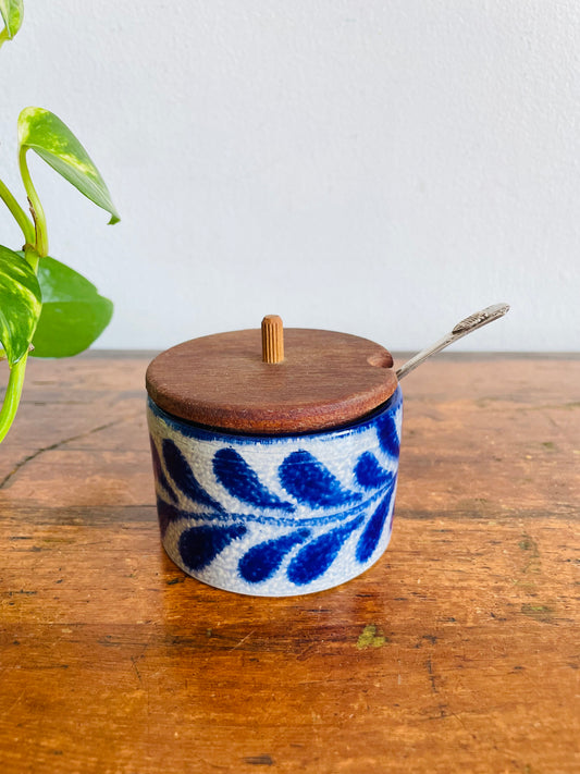 Vintage Salt Glazed Stoneware Container Jar with Wood Lid & Handle - Blue Leaf Pattern - Salt Cellar, Spices, or Sugar Dish - Includes Optional Spoon