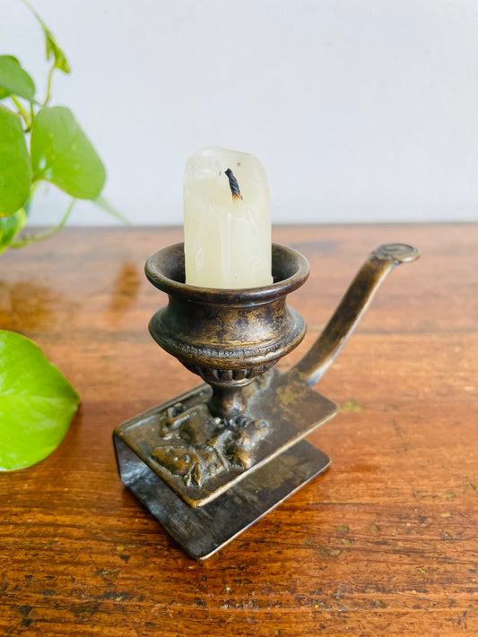 Vintage Solid Brass Chamberstick Candle Holder with Matchbox Drawer Holder - Embossed Equestrian Design of Horse & Rider - Includes Box of Wood Matches