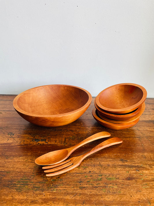 Vintage Brand New in Box Baribocraft / Lesko Baribo Maid Wooden Salad Serving Bowl Set with Utensils - Made in Quebec, Canada - Set of 7 Pieces