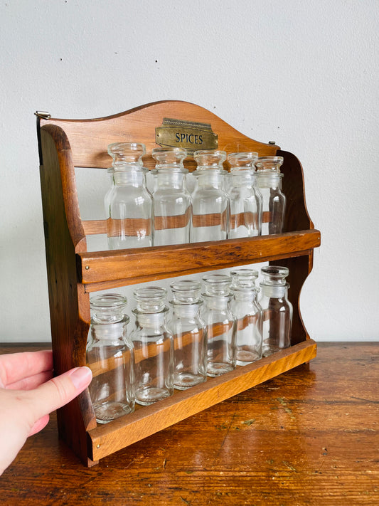 Vintage Wood Spice Rack with 11 Glass Spice Jars - Can Hang on Wall or Stand - Made in Taiwan & Japan