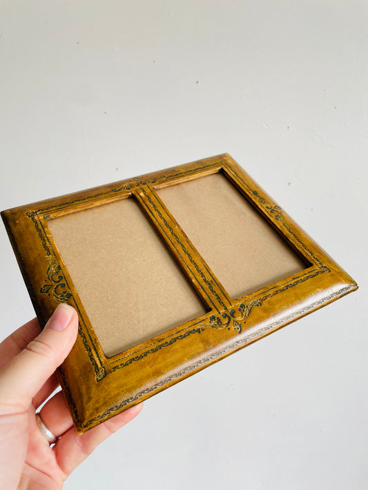 Vintage Genuine Italian Leather Brown Double Picture Frame with Scroll Design - Made in Italy - Easel Backing